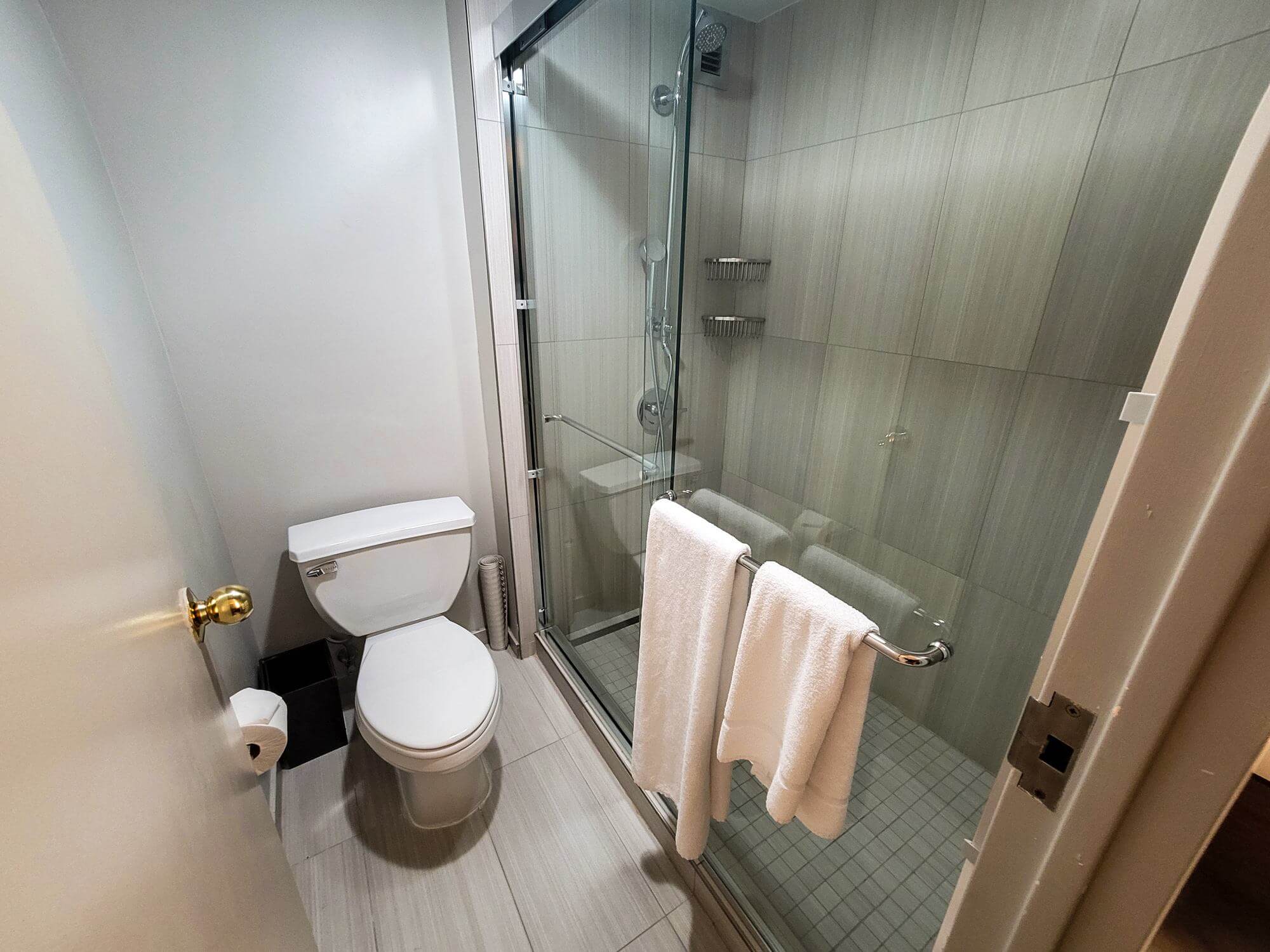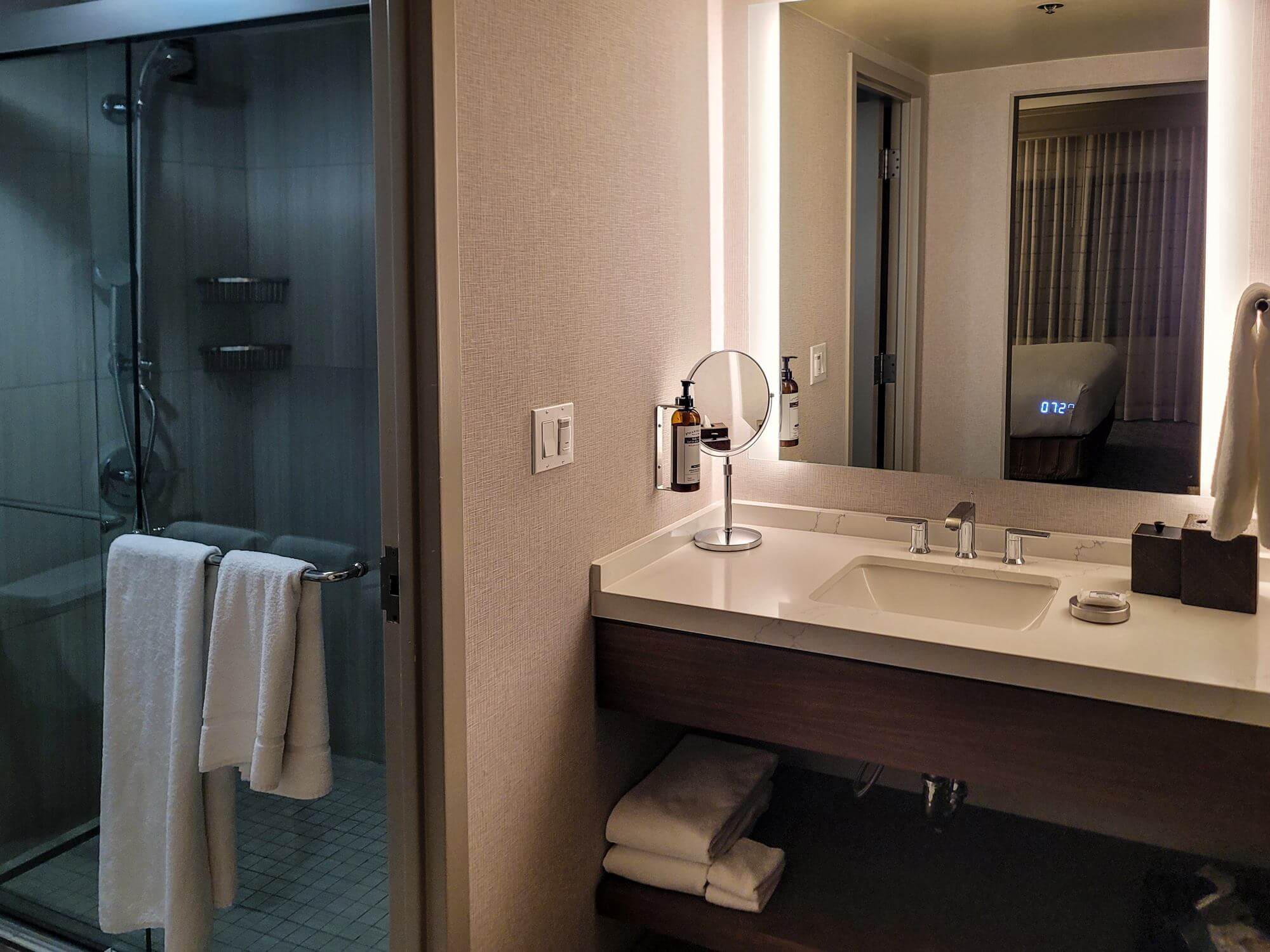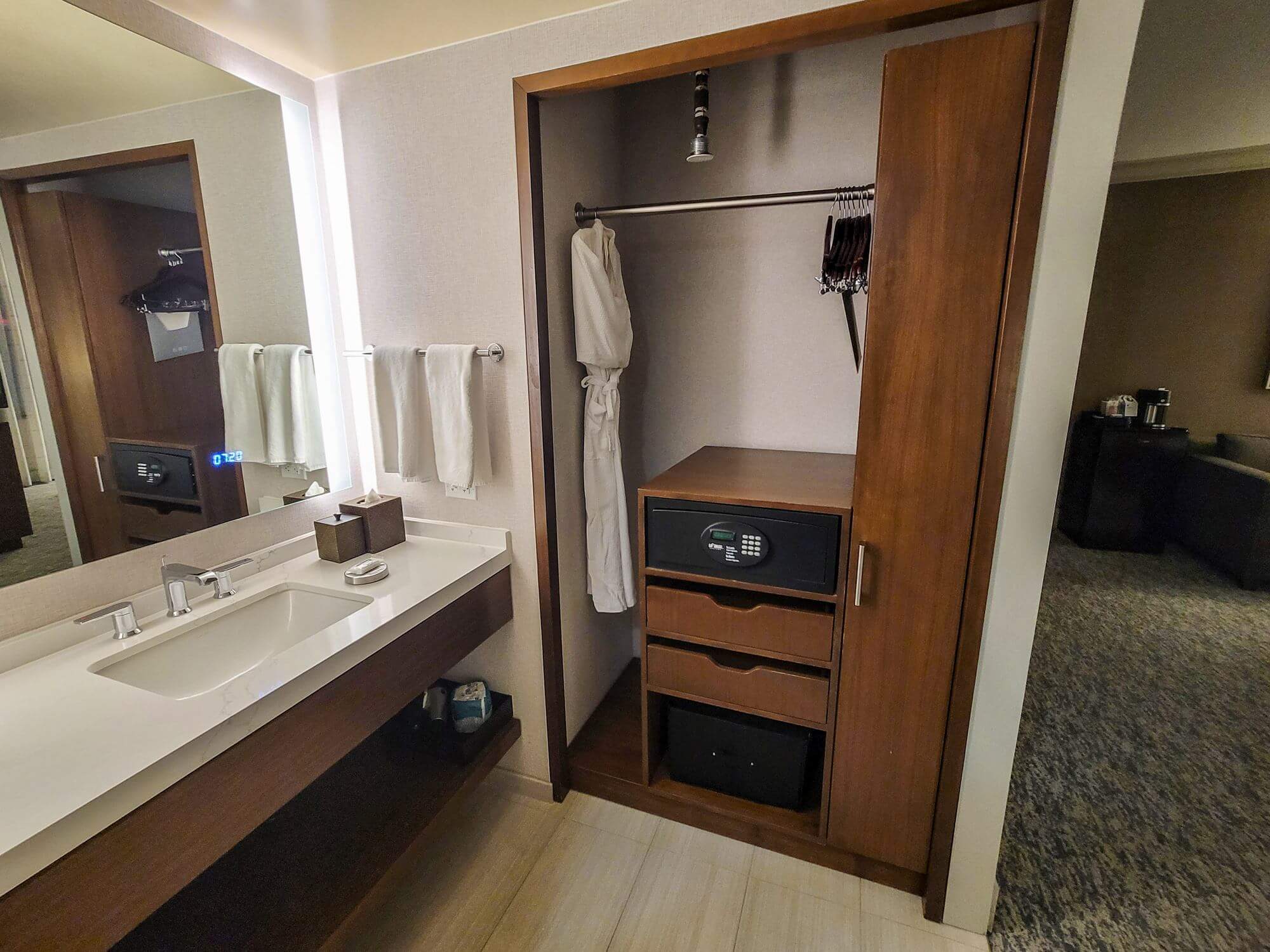 The bathroom is a separate area of the suite. The open entrance with no door leads to the vanity with a single washbasin and a large wall closet to store clothes. Inside the closet you also find the in-room safe as well as an iron and ironing board. The large wall-mounted mirror has a hidden clock in it. Once you turn on the light, it will show the current time. Pretty neat.