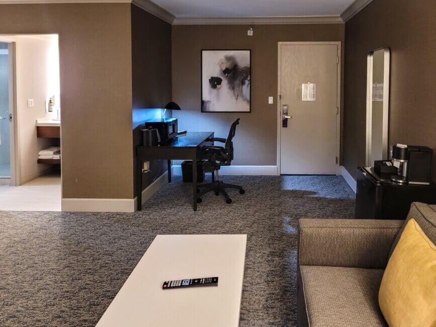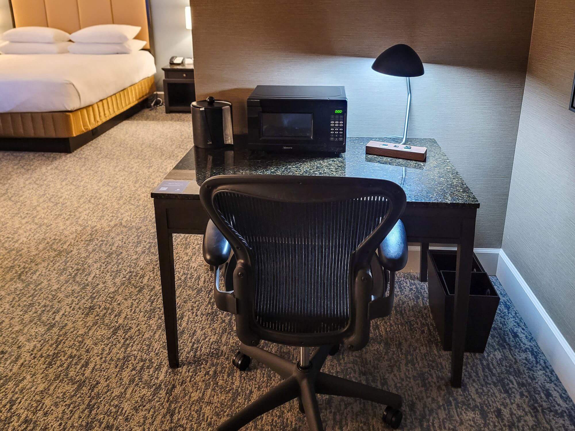 Next to the entrance door is the “generous workspace” as it is called on the hotel’s website. However, they thought placing a large microwave right there was a good idea. It took up all the space. I unplugged it and set it down as I wouldn’t use it anyway and I needed the extra work space.