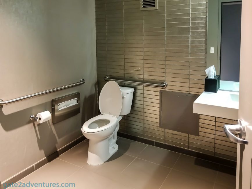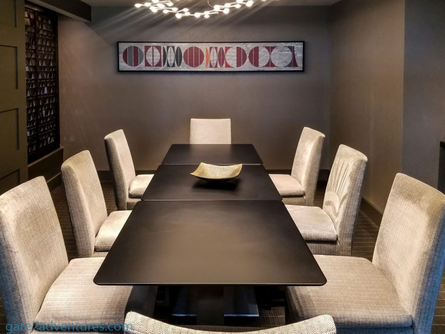The lounge space is pretty big for that hotel and has lots of comfortable seating. Most of the seating places are focused on being dining tables. Right when you enter you have the staff counter. To my surprise, there is also a unisex restroom. This is the second place I have seen a restroom in the Hyatt lounges, the only other one I know is the Grand Hyatt in Hong Kong. Behind the counter is a meeting room separated by two sliding glass doors.