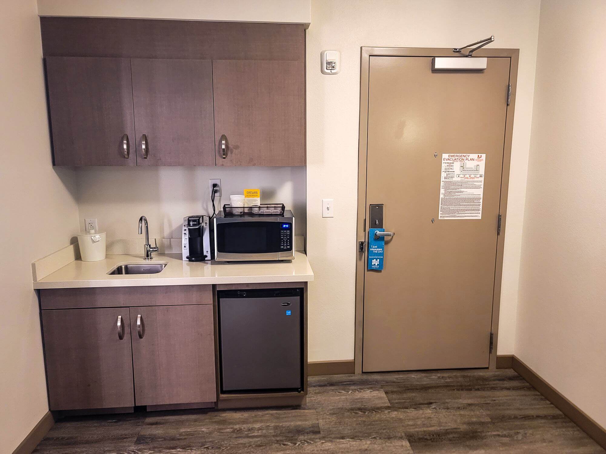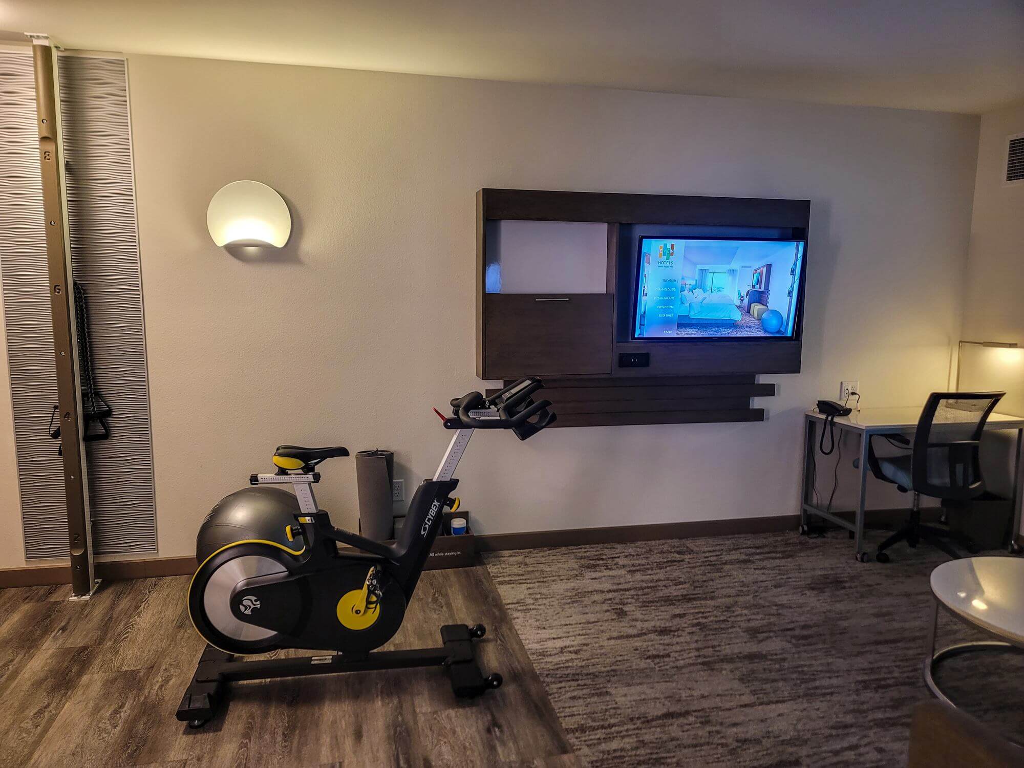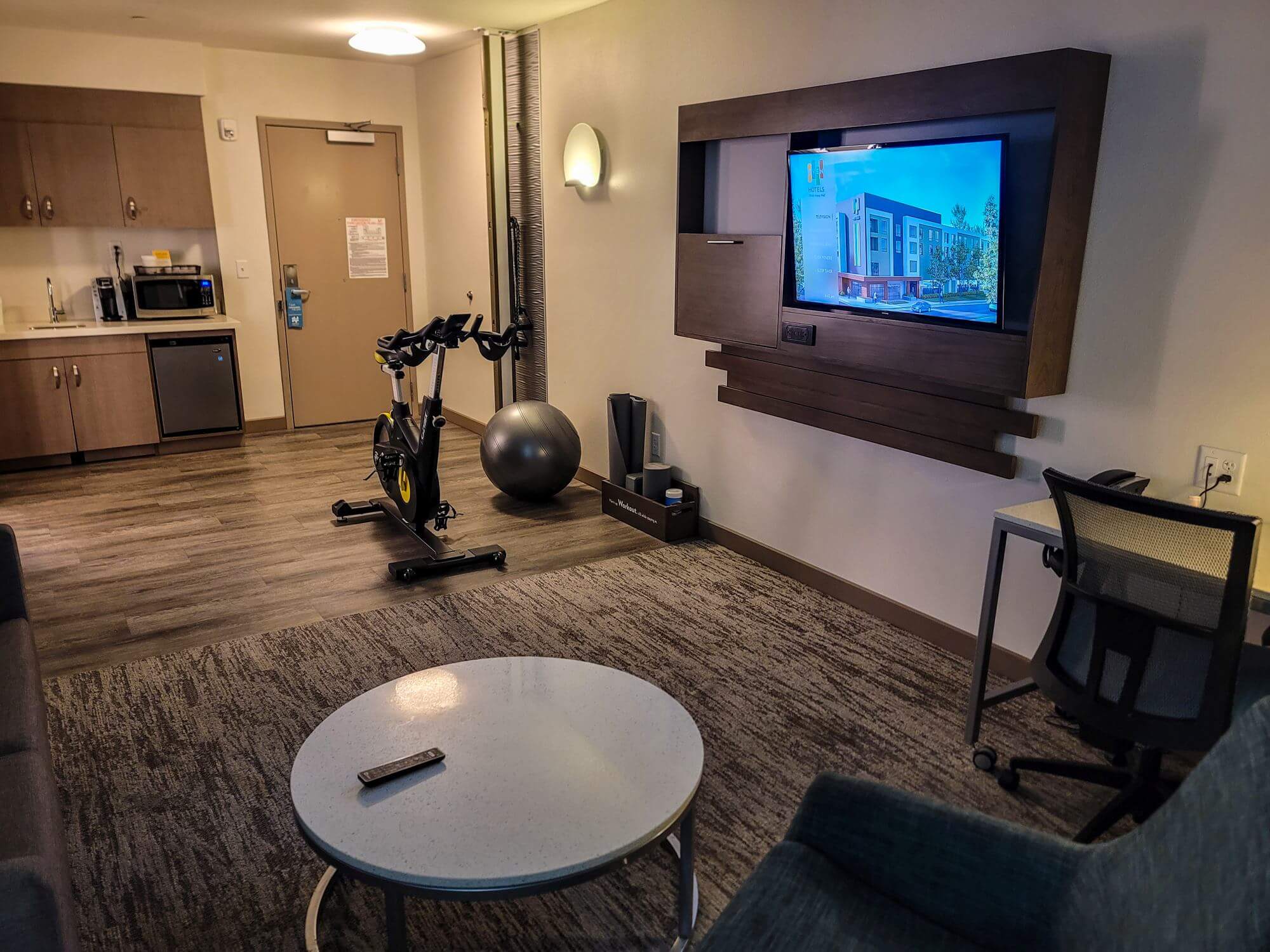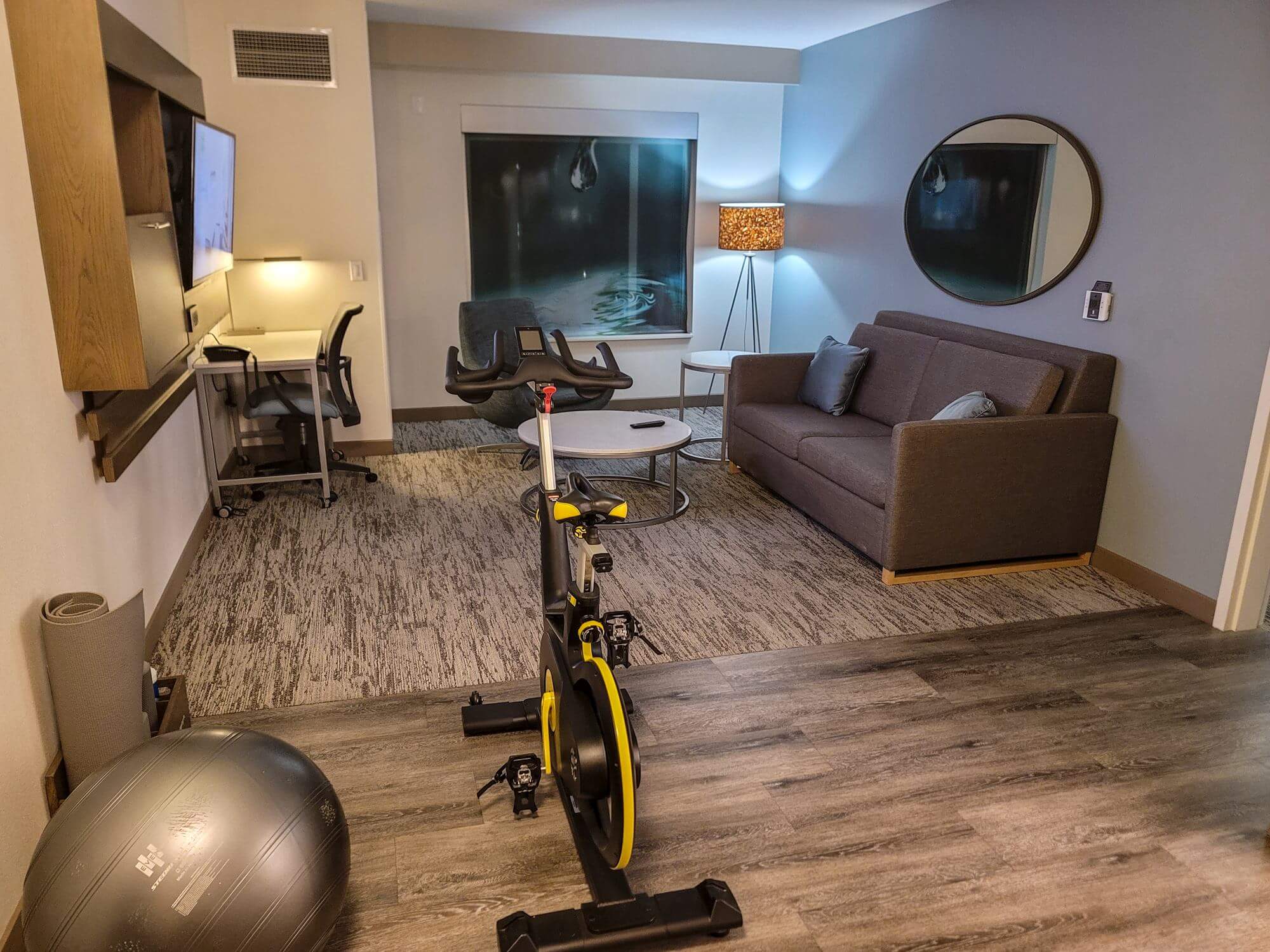 As you walk into the suite you have the living room space right in front of you. It comes with a stationary bike and other workout equipment like a yoga mat. Next to the entrance is a little kitchenette space. It has a sink but all the cupboards are empty and no utensils or dishes are provided. There is a coffee maker on top of the counter.
