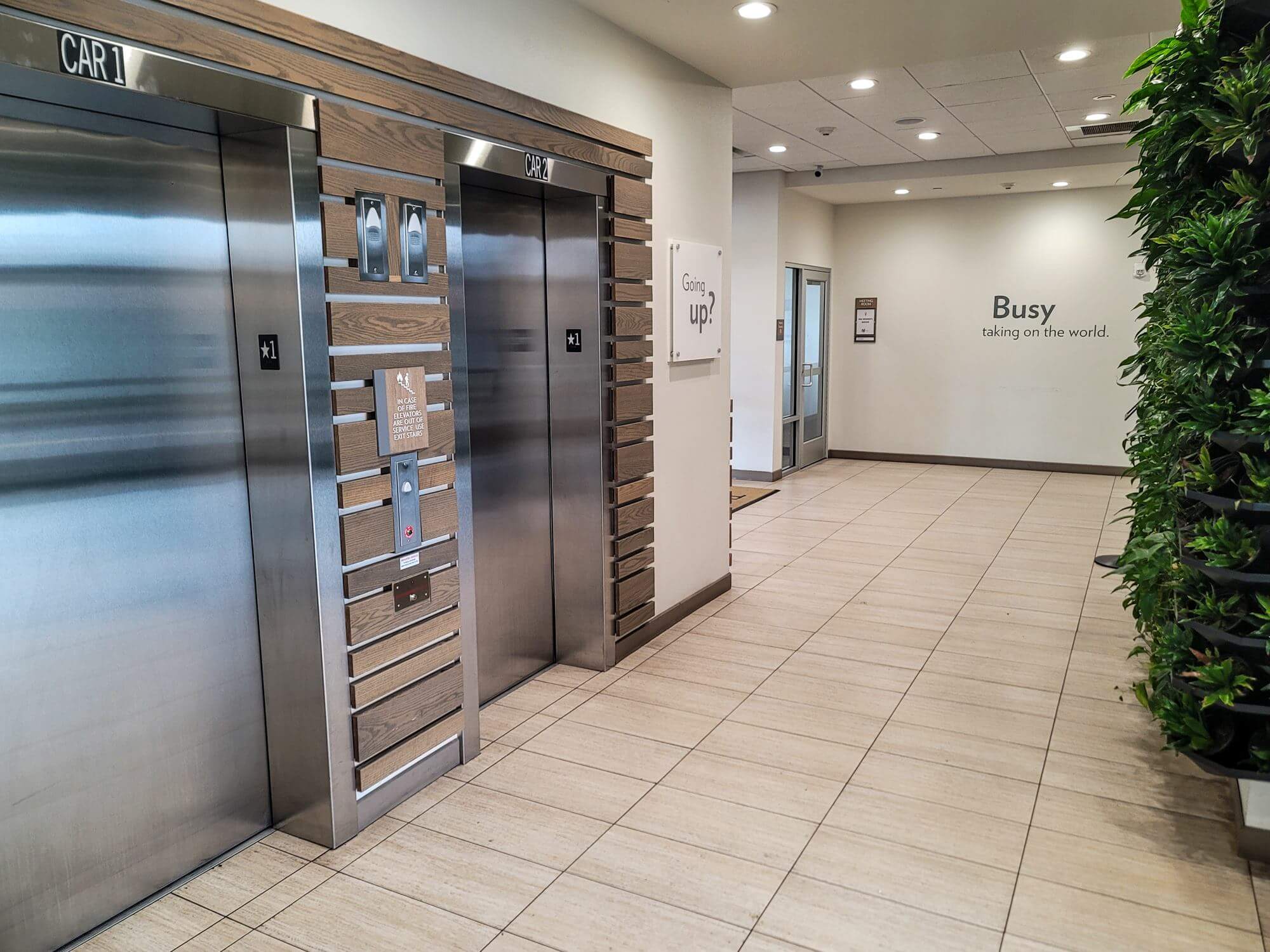 As you walk into the building from the parking lot, you have to turn to your right and take the elevator or stairs up to the second floor where the lobby is located.