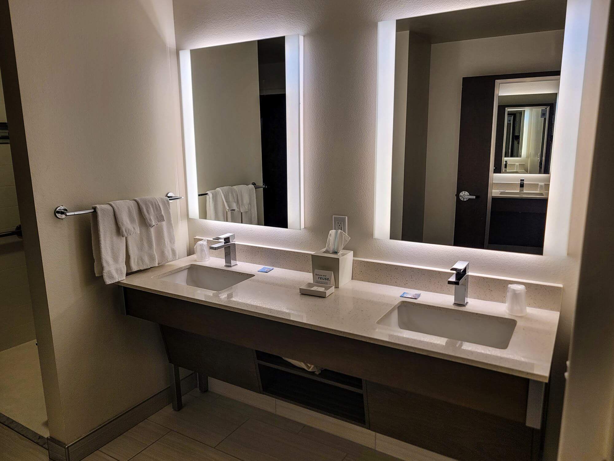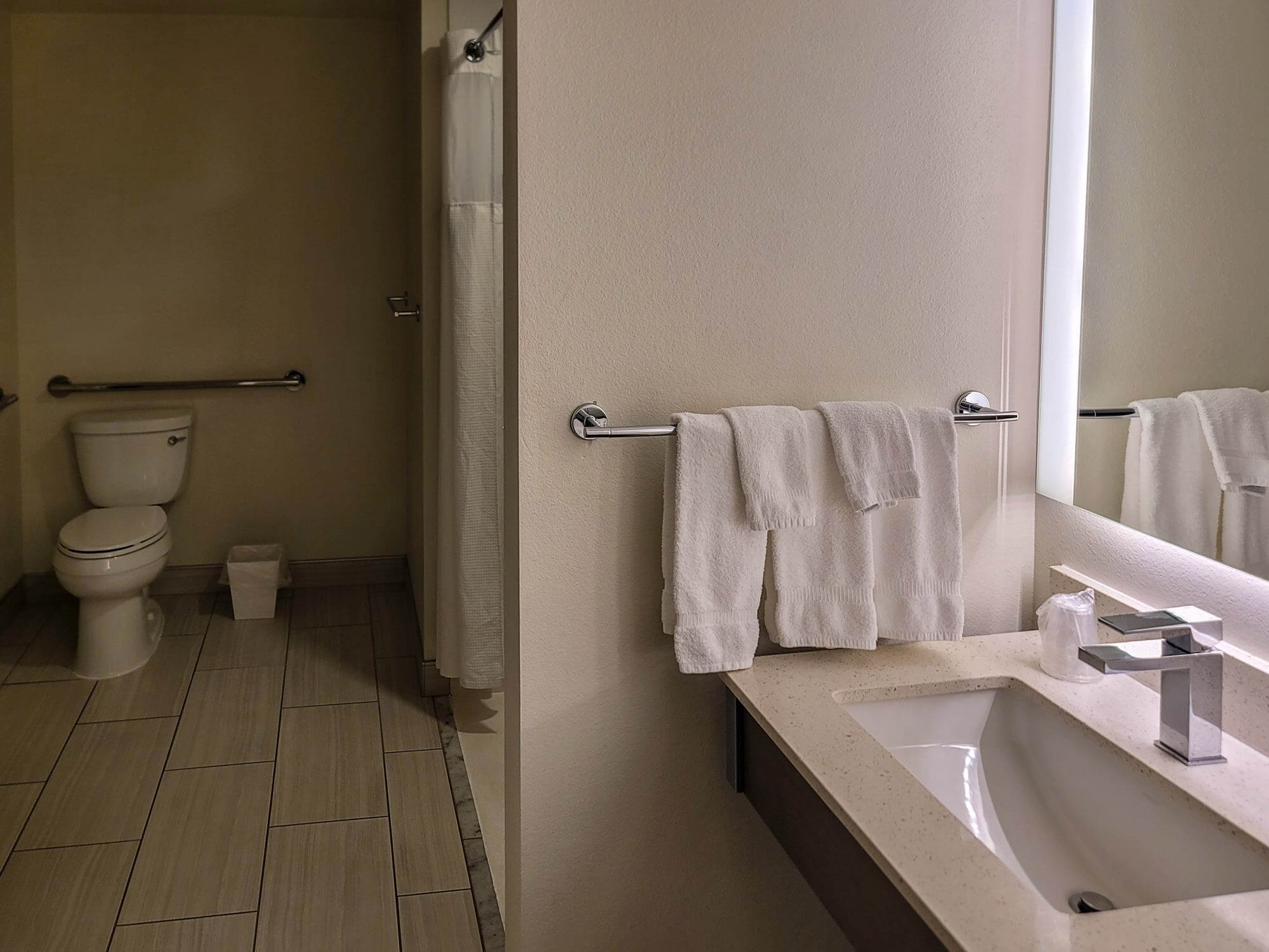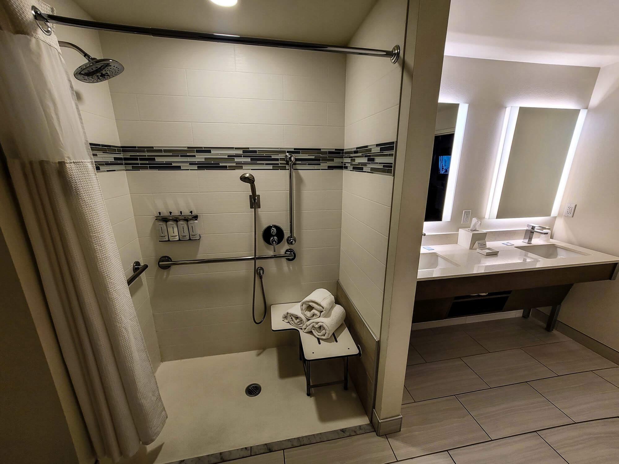 The agent also upgraded me to a suite and asked if I minded if it was an accessible suite which had a roll-in shower, additional shower wand and the fold down chair in the shower. I didn’t mind at all, as I would be staying one night only. I arrived past 8 p.m. so I had not much time left anyway in the suite as I would leave just before noon the next day to head to the airport.