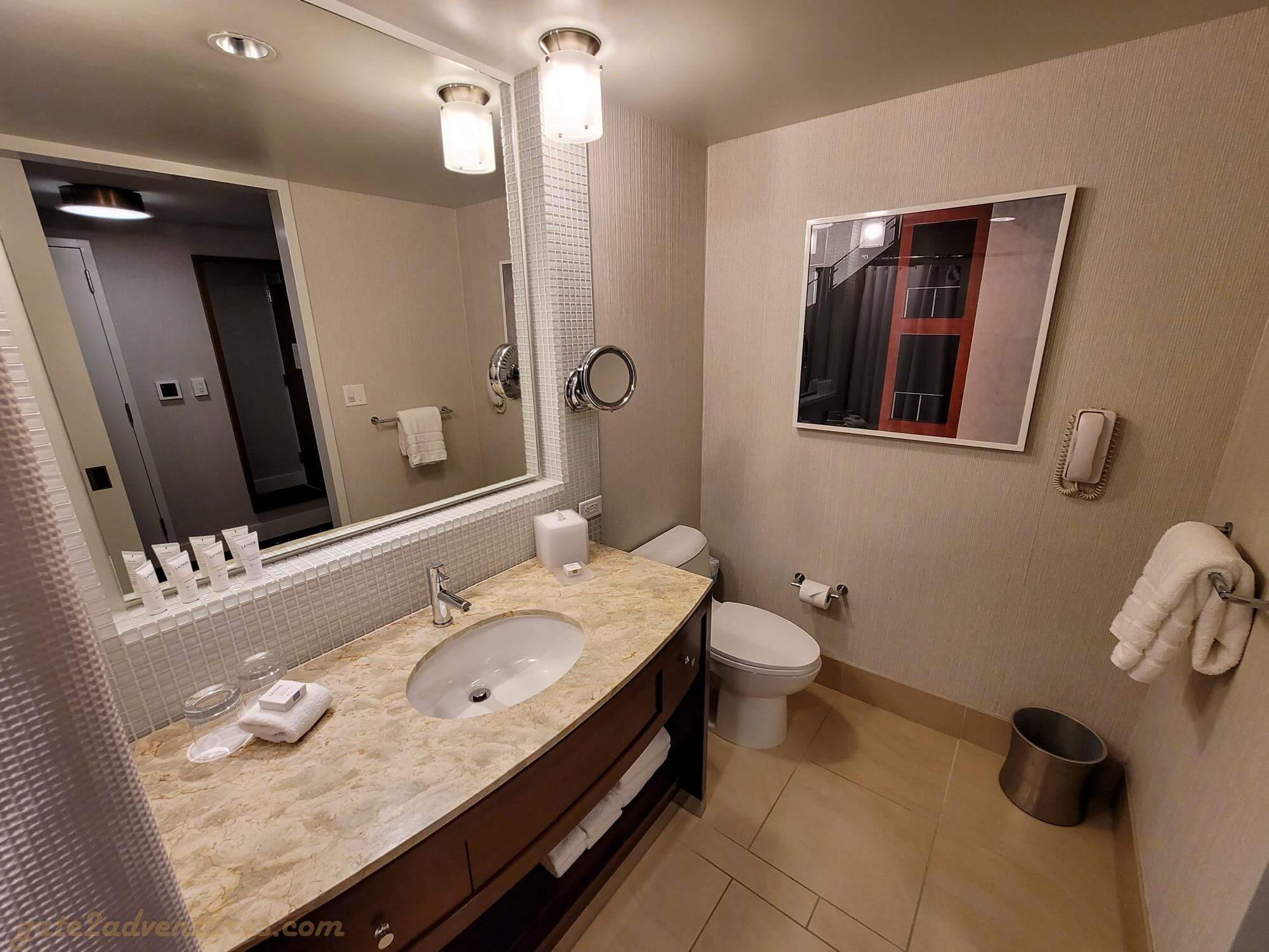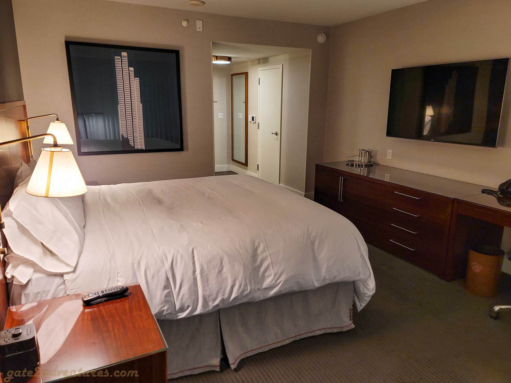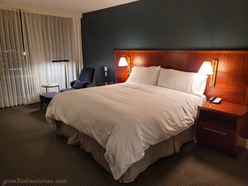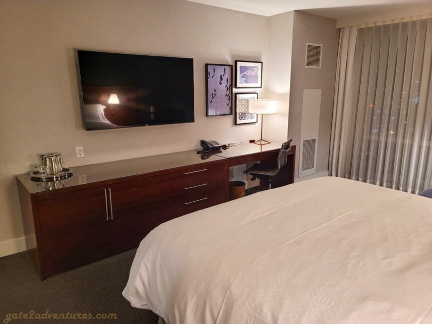 I arrived via Uber at the hotel. For this short stay, I only had a carry-on bag with me besides my usual luggage entourage I carry with me. Two agents were working the check-in counter that evening and I only had to wait like a minute for one agent to finish checking in the person ahead of me. While looking up my reservation the agent saw that I booked through Amex Travel and asked me if I was driving a car. There were two reasons. First, there is, unfortunately, an outrageous valet parking charge of $67/night. Self-parking is not available at all. Second, with my Amex Travel booking, I have the choice of two packages. Package A gives you the $100 food and beverage credit while Package B gives you free parking but only $23 for food and beverage. Unfortunately, $23 won’t get you far at this property. See more about it in the dining section. As I wasn’t parking a car, I went with package A for the $100 food and beverage credit. Remember, this credit is for the whole stay, not per day. I also checked if they could upgrade me to a better room, hopefully, a suite and he told me that they upgraded me to a better room on a higher floor. It wasn’t a real upgrade, in fact, I had to find out later. As their more expensive “view” rooms face the city and I faced the opposite direction, and it was still a regular room with a Queen bed.
