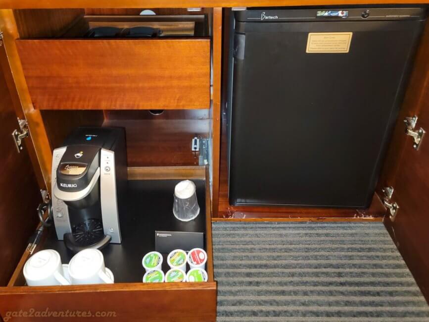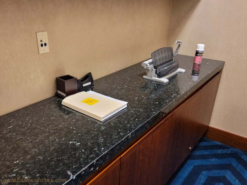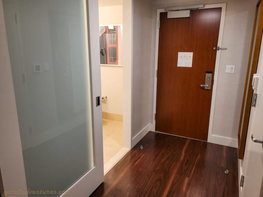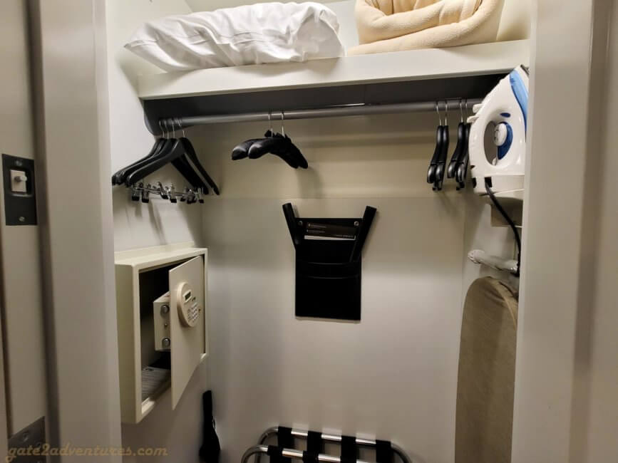 The room has an entryway which has the bathroom to the right and a wall closet to the left. Next to it is a full-size dressing mirror. The closet also houses the in-room safe and has an umbrella stored in it. You can buy one or if you take it “accidentally” with you, you get charged $25 either way.