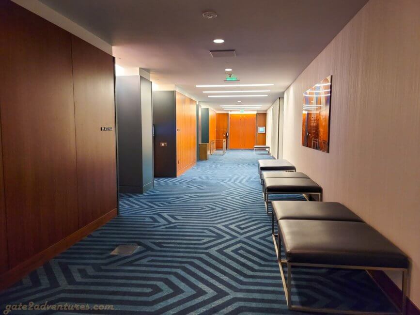 The lounge is located on the sixth floor. Exit the elevator lobby and head down the hallway to the right. There are also signs getting you to the lounge. Unfortunately, the lounge is temporarily closed because of the Coronavirus pandemic.