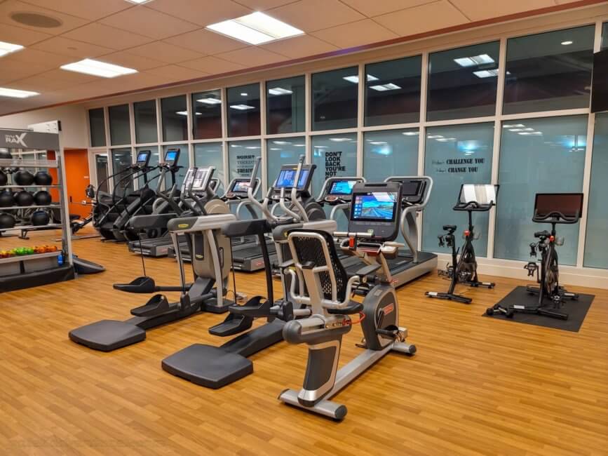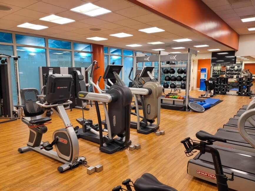 The fitness center is located on the sixth floor of the hotel. From the elevator, head down the hallway to the left and follow the signs to the fitness center. For access, you need your room key. Inside you will find a very well-equipped fitness center. There is also a water dispenser inside the gym to keep you hydrated. The fitness center is located between another terrace and the indoor swimming pool. Only a partly frosted glass wall separates the fitness center from the swimming pool.
