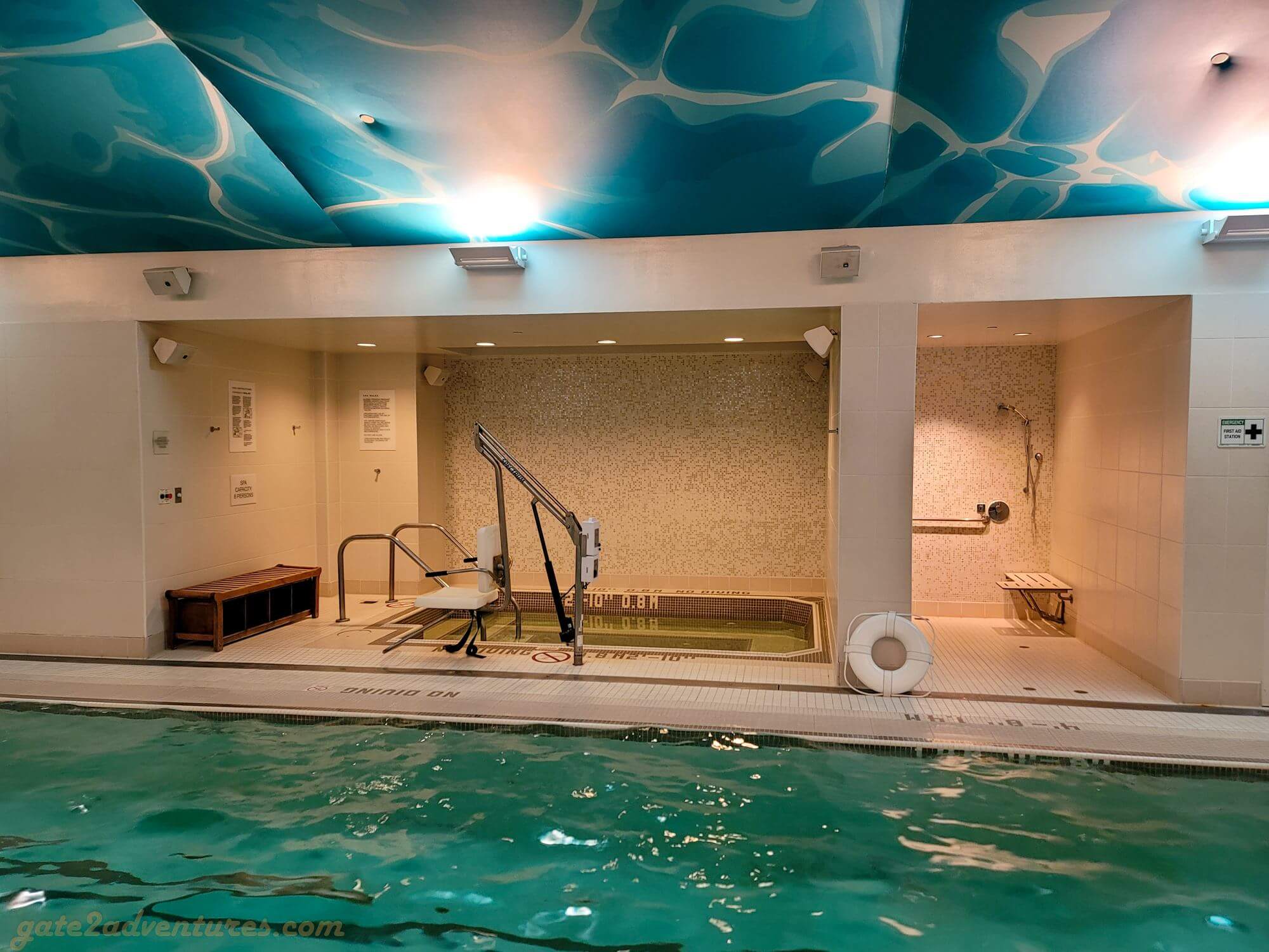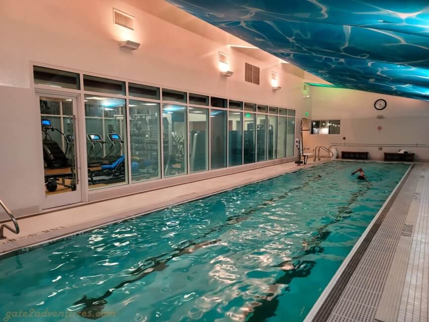 The hotel features a beautiful indoor swimming pool. It is located right next to the fitness center. Just follow the signs from the elevator to the pool. Enter the pool with your room key. The pool itself is long and narrow which makes it perfect to work out and swim a few turns. It’s less geared towards just hanging out and floating. In the same room, you also have the indoor whirlpool, which sits next to the pool. The roof of the pool area has a sky and clouds painted on it.