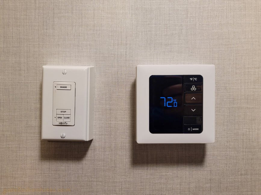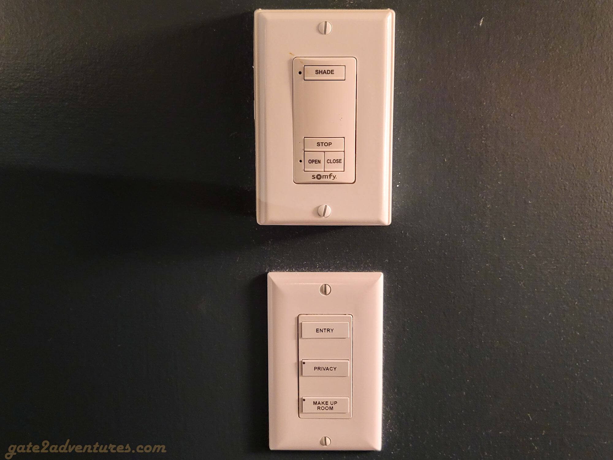 The black-out shades are electrically controlled and there is a switch between the bed and seating area as well as in the entryway near the room door. The shade goes up and down automatically and will stop when it’s fully closed or opened. However, you can stop it manually in any position you like, and which is comfortable for you. Next to the shade controls in the entryway are also the buttons that you would normally use for housekeeping. Instead of hanging a sign on the handle, you just push the button for privacy and the housekeeping crew knows not to enter. There are also buttons to allow them to enter and to actually request to make up the room. However, this service is currently unavailable. Housekeeping must be requested currently through the front desk. Also not too far are the wall-mounted air conditioning controls. A display shows the current temperature as well as the set temperature and system status. The actual AC unit is in the corner between the work desk and the window.