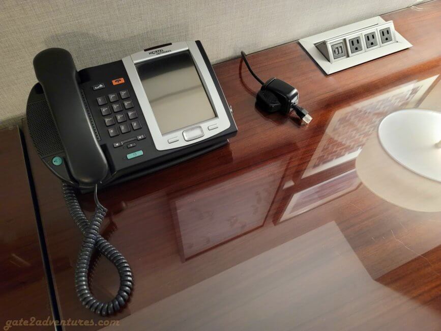 As you continue on the entryway it transits into the sleeping area. There is ample space in the whole room, and you won’t feel cramped. Along the left side of the room, you have a long dresser which also has a work desk attached to it and comes with an office chair. The dresser also houses the minibar, which is currently empty because of Covid-19 pandemic. Why this is a concern for corona would be interesting to know. Maybe it’s just because they won’t restock it during your stay as they won’t enter your room with you in it. Even though regular housekeeping is suspended, you can request it through the front desk if you need it. The dresser and desk have a glass top. On top of the dresser, part was an ice bucket as well as regular glasses and wine glasses including a bottle opener. Atop the desk part is a fancy telephone with a large screen. It’s one of those full-fledged business phones, but it wasn’t working during my visit. Neither the display turned on, nor could I even make a call. I didn’t investigate any further as there was no way that I ever needed it. Above the dresser is a large wall-mounted flatscreen TV which is directly opposite the bed.
