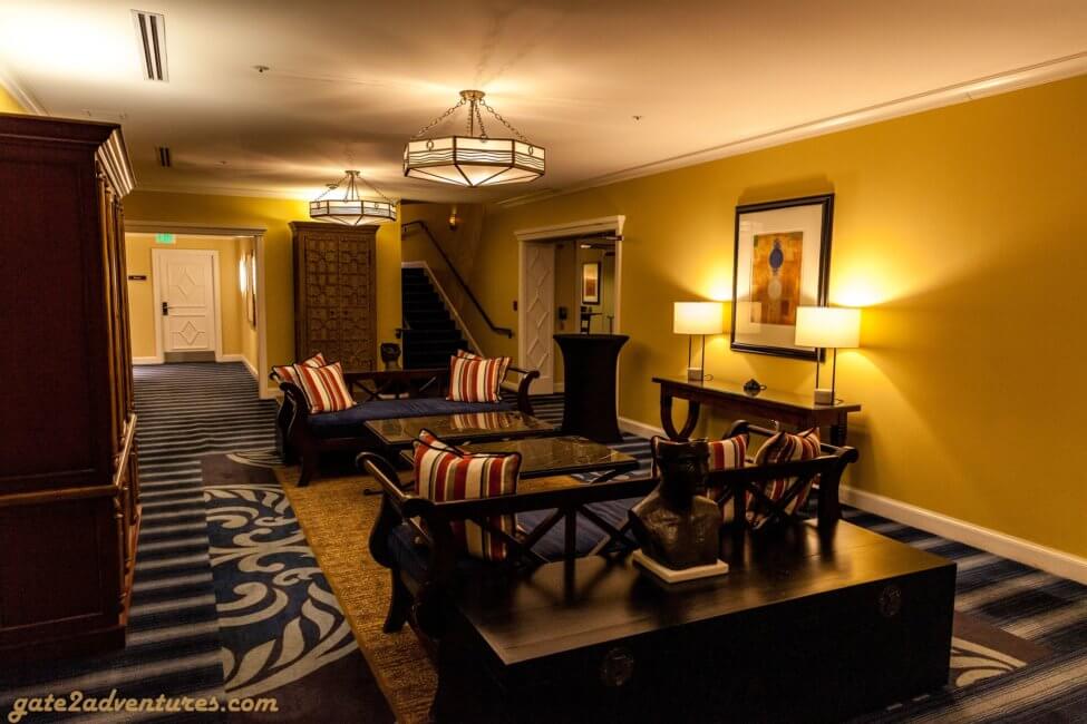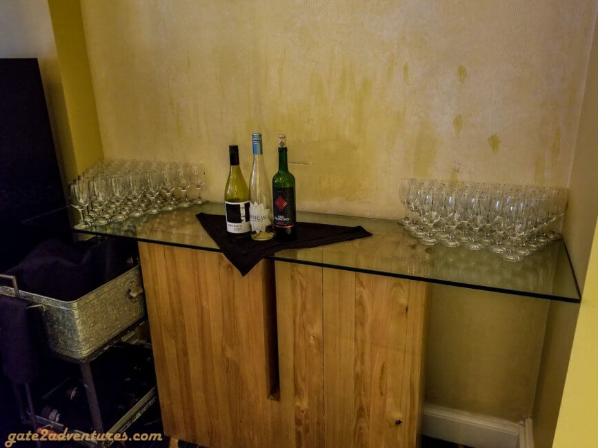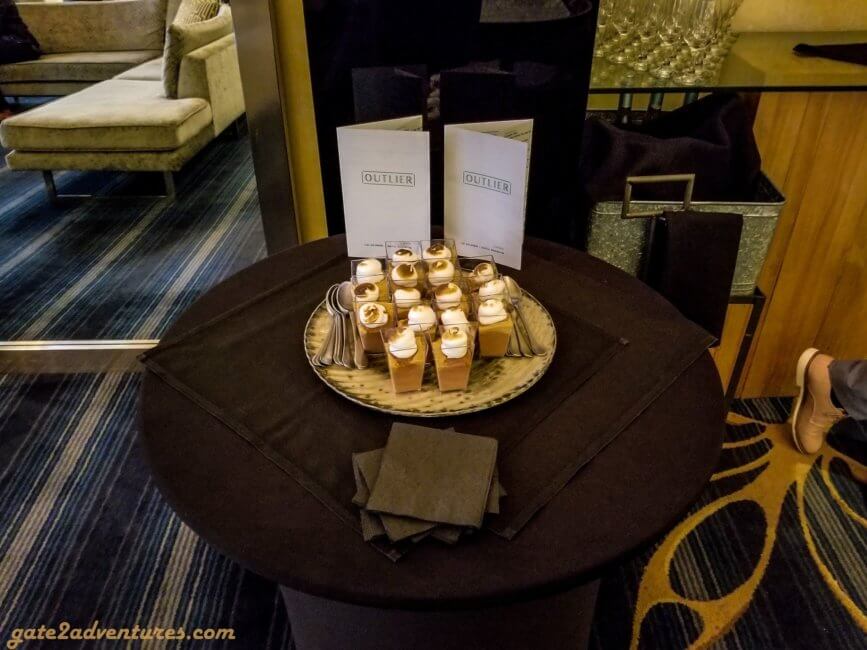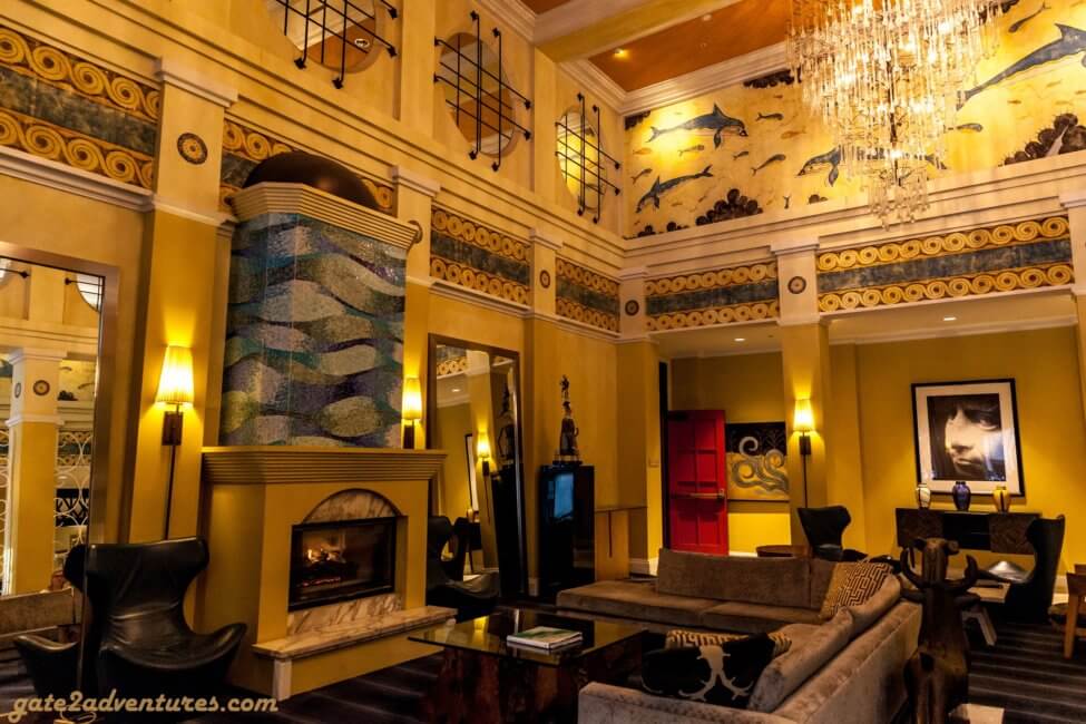 Once you walk into the lobby you are blown away by the tall ceilings and the incredible details in the decoration like the beautiful chandeliers. There is lots of seating in the lobby and a fireplace with mirrors on either side angled towards the ceiling. This just invites you to come down here and hang out. Another reason for hanging out in the lobby is the wine tasting event every day from 5 p.m. until 6 p.m. right next to the entrance to the restaurant “Outlier”.