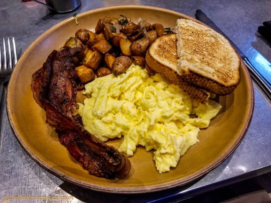 During my one-night stay at the Hotel Monaco, I had breakfast the next morning at the Outliner Restaurant. Breakfast started at 7:00 a.m. and I got there by 7:30 a.m. and was one of only three guests there. This made it easy to get service and there was no wait time at all. As soon as I walked in, one of the waiters took me over to a booth. I ordered coffee and orange juice right away while browsing the menu. I decided to go with the “two egg any style” breakfast. As my sides, I chose bacon and sourdough toast. While enjoying my coffee, I only had to wait a few minutes before my breakfast was delivered. It tasted great and was a good size to start the day. After breakfast, I asked the waiter if I could have a cup of coffee to go, which was delivered right away with the check for room charge.