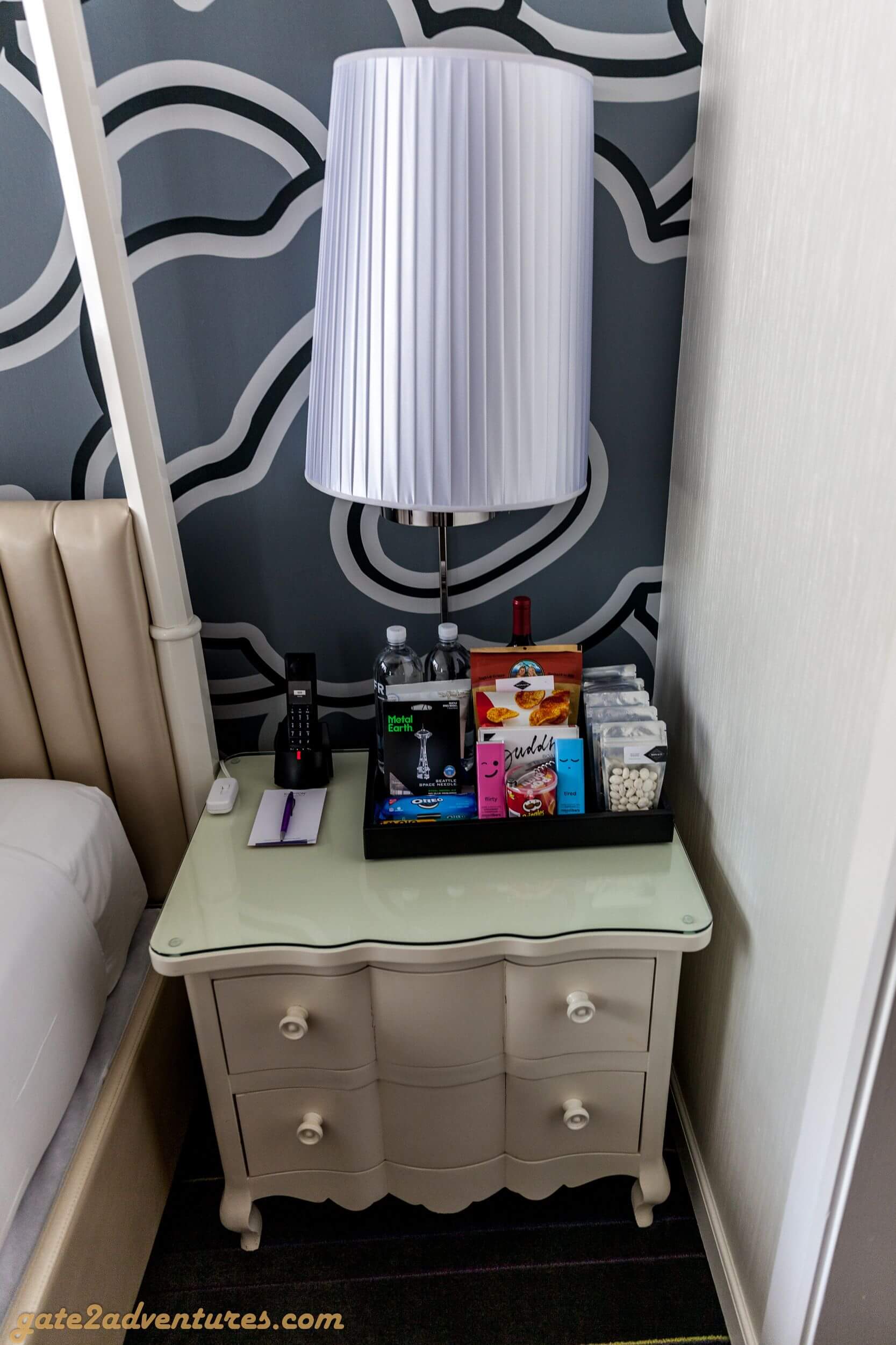 A curtain separates the living room and bedroom. The king-sized bed is located centered on one side while a closet is directly across from the bed. On top of it a TV and DVD player. On either side of the bed is a nightstand which also has additional storage for you to use. On top of one is a small snack buffet, which is part of the minibar. I had to look first to find a power outlet to charge my phone and almost thought how can a hotel not have any power outlets next to the bed. They are actually a little bit hidden. You can find them on the side of the nightstand facing the bed. One of the nightstands had only one outlet while the other one had two. When I plugged in my phone charge it almost fell out again. The outlets are a little wide and loose and don’t really hold the charge in place very well. You have to be careful not to pull too much, as it will fall out. The lights on either side of the bed are dimmable with the little slider-switch on top of the nightstand.