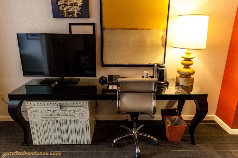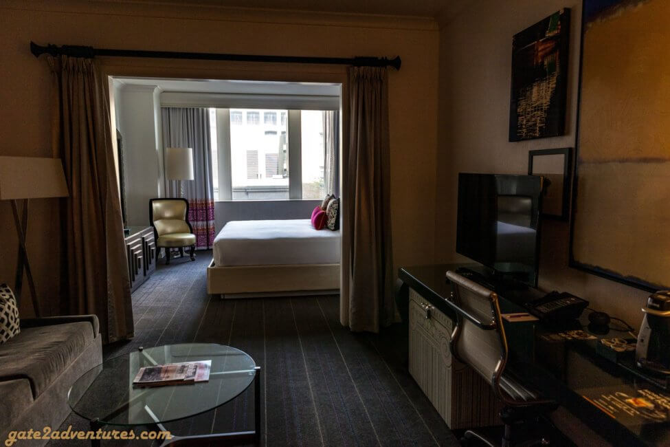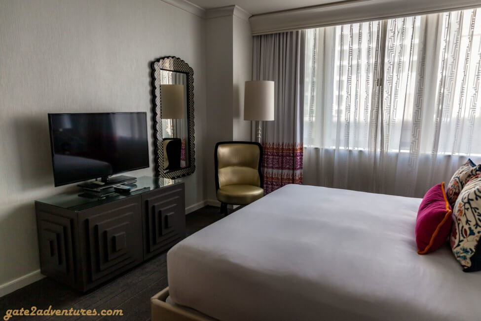 Inside the bedroom, is also a dressing mirror and chair. The big window at the end of the room gives you a view of 4th Ave but it’s not a pretty view as this room is only on the 5th floor.