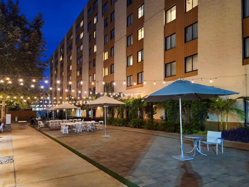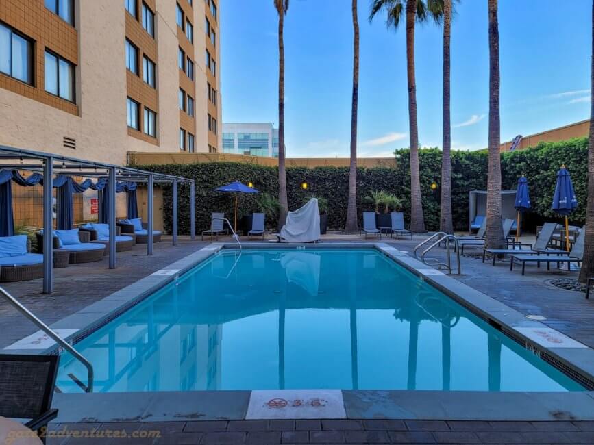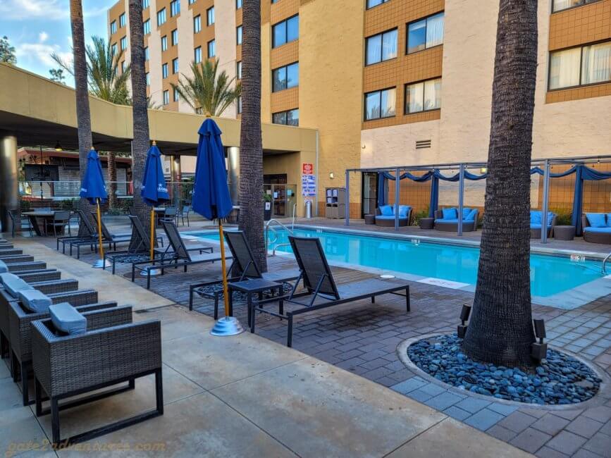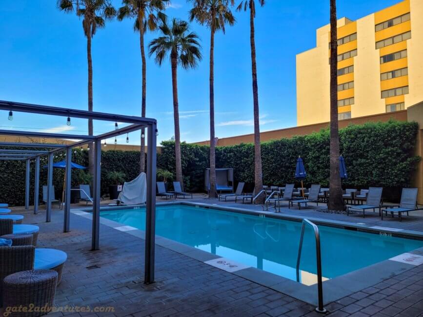 The Los Angeles Marriott Burbank Airport consists of two towers referred to as West and East Tower and on their website sometimes also as Burbank and Hollywood Tower respectively. When entering through the main entrance, you will enter a part of the building which is directly attached to the West Tower/Burbank Tower. To get to the East Tower you will exit another set of double sliding doors which brings you by the Eat Drink Be Restaurant on the one side and the pool on the other side. More about these two later.