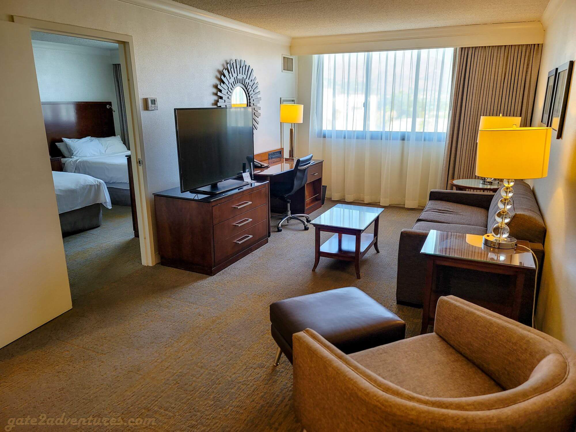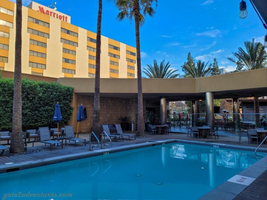 The Los Angeles Marriott Burbank Airport is, as the name suggests, located right next to Hollywood Burbank Airport in Burbank, CA. The hotel is so close to the hotel, you can walk in 10 minutes from the hotel to the terminal. It’s probably faster to walk to the hotel than calling a ride-share or waiting for the complimentary hotel shuttle bus. However, if you travel heavy as I do. It’s definitely easier to wait for the hotel shuttle.