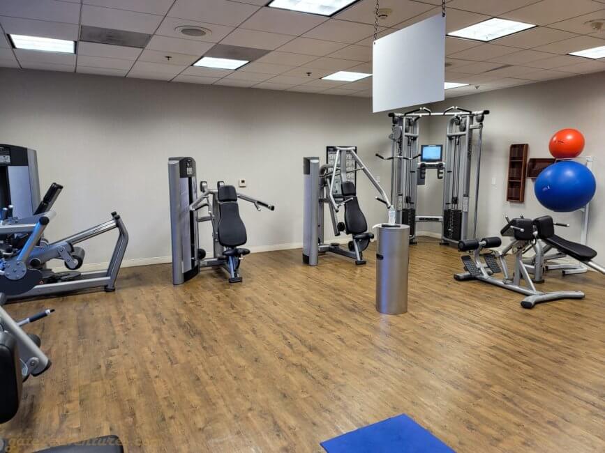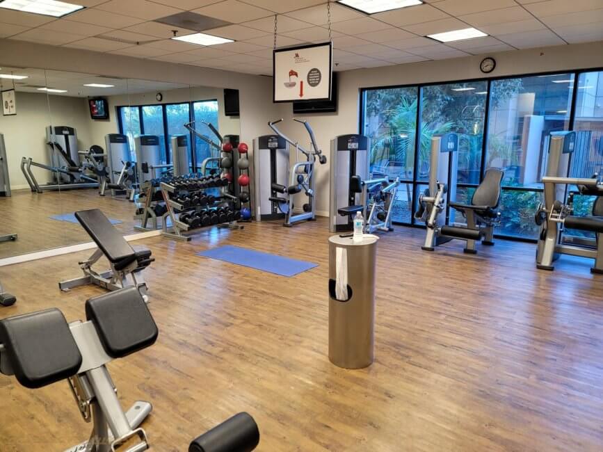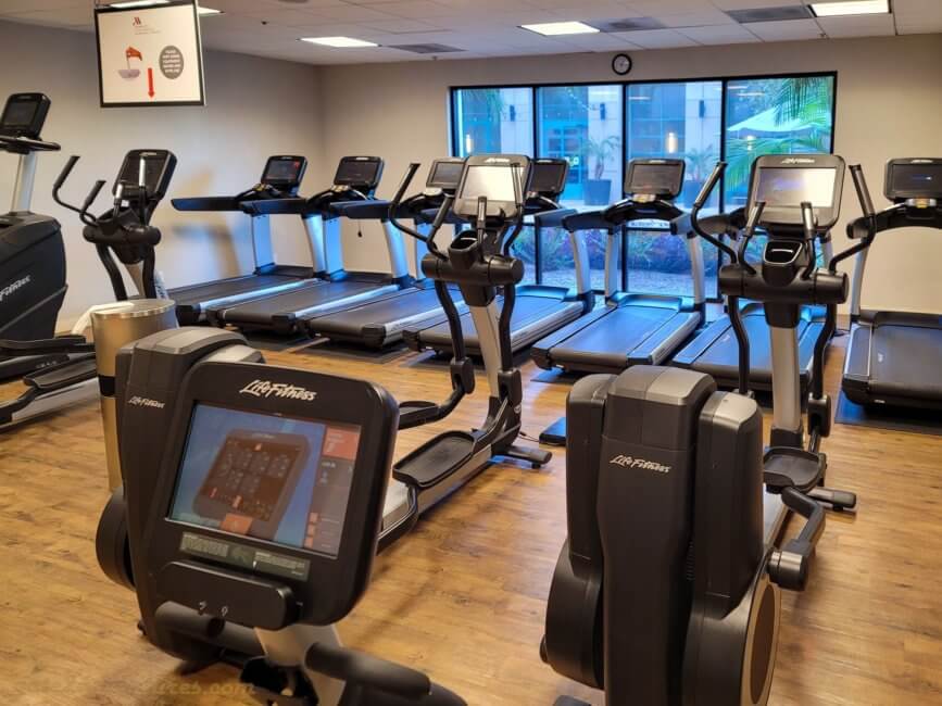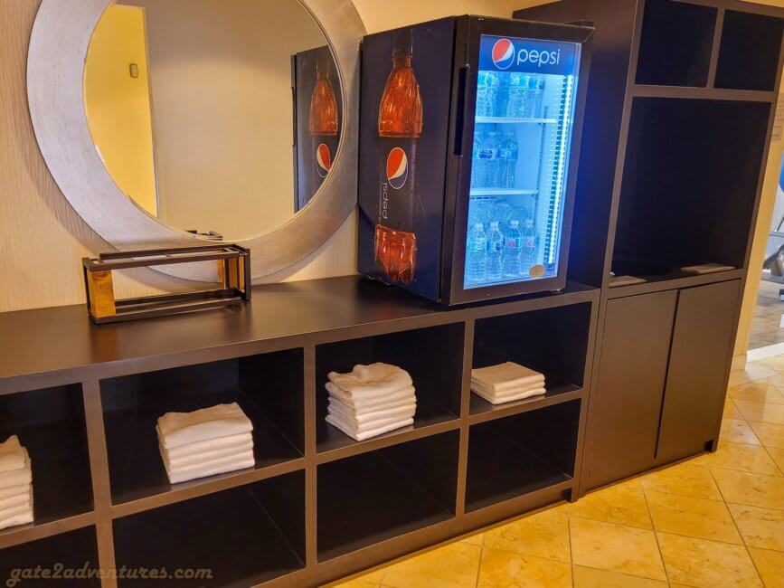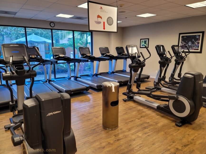 The fitness center is open 24 hours a day and is located on the ground level inside the East Tower. When you enter the East Tower coming from the West Tower, the fitness center, or health club as it is called here, will be on your right. It is separated into two rooms – Cardio Room and Weight Room. Inbetween you find a rack with towels for your workout and a refrigerator with complimentary fresh and cold waters. Near the rack are also the pool toilets which can be accessed from the health club side or directly from the pool area.