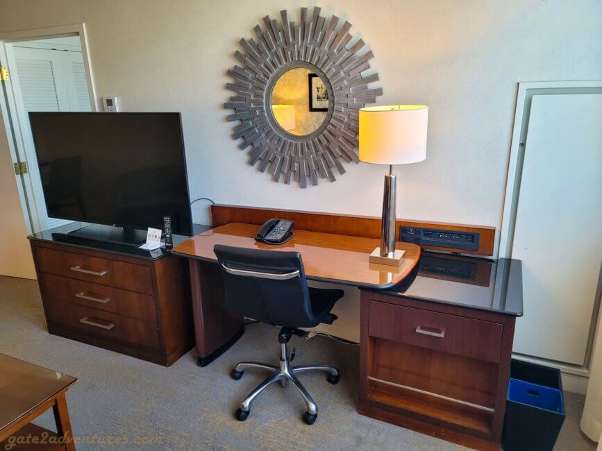 During another stay at the hotel, I was able to score a complimentary suite upgrade. The suite is located in the East Tower aka Hollywood Tower. When you enter the suite you will first notice the tiled floor around the entry area. This probably also doubles as the “dining area”. In the corner is a small round table with two chairs. Along the wall is a countertop with drawers and shelves. It also houses a small refrigerator. However, there is nothing else in the room which would allow you to prepare any kind of food. No microwave, stove, or anything else. Only a coffee maker and an ice bucket.