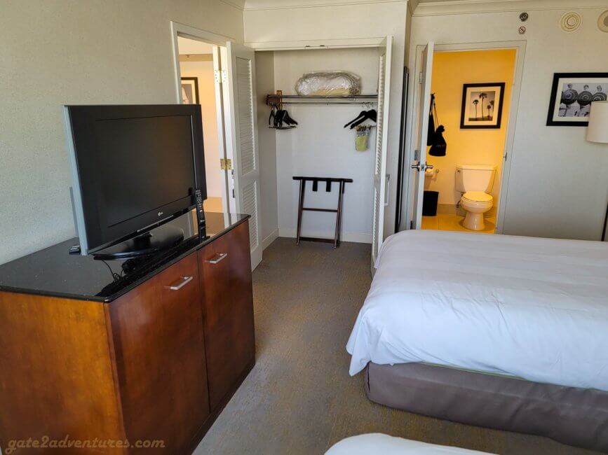 Opposite of the beds is another but smaller TV on top of a closet with extra storage space. Next to the bedroom door is a full-size wall closet. Next to it is the bathroom door.