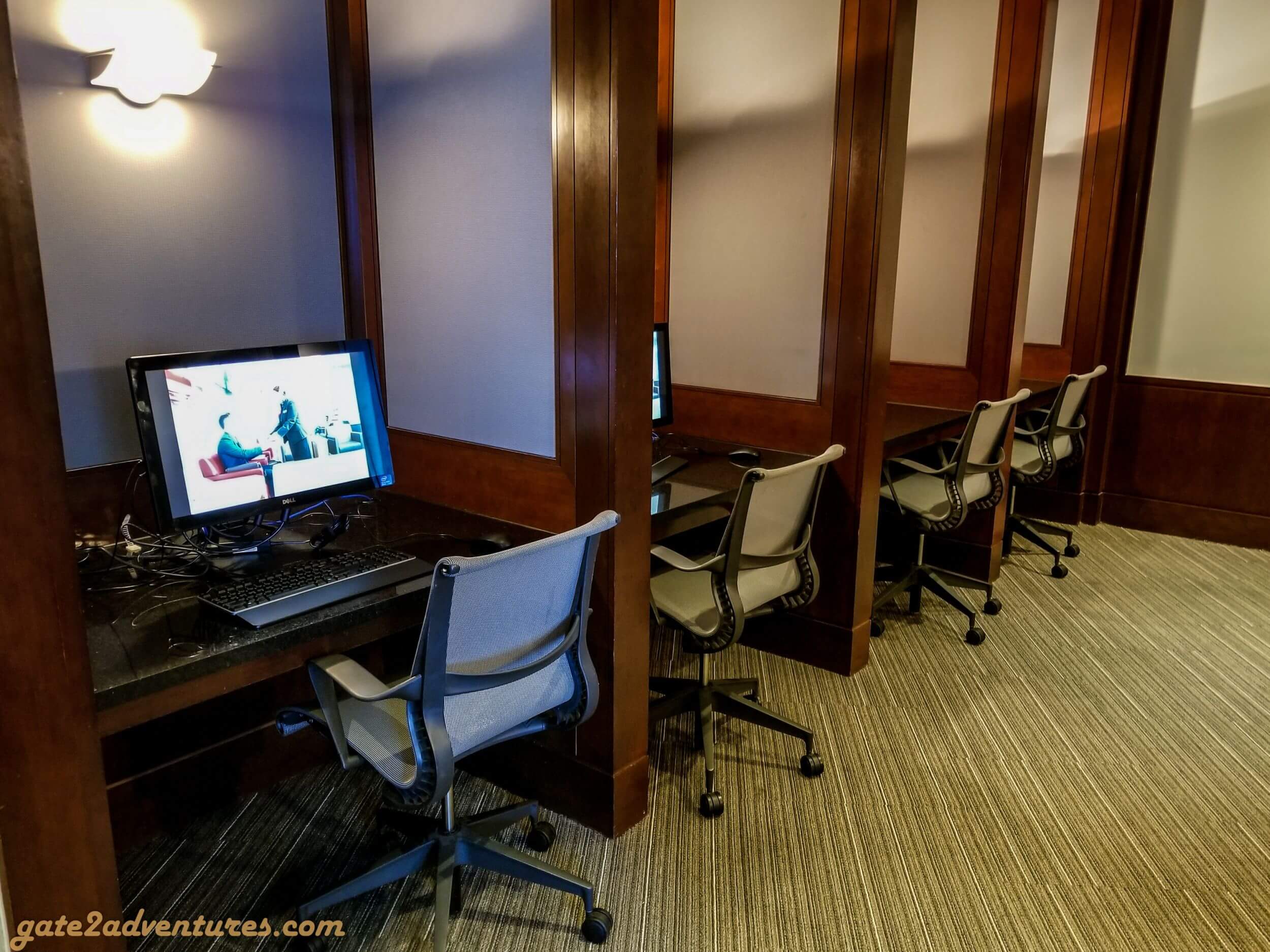 This area has large windows all the way around with a few of the tarmac. There is another seating area on the right side just past the bar area as you walk in. This area also has large windows with views of the tarmac and a TV. On the right side of the lounge is a small entrance to the work carrels. It’s pretty hidden and this work area had just one person sitting in there during my outbound flight and during my return, nobody was in there.