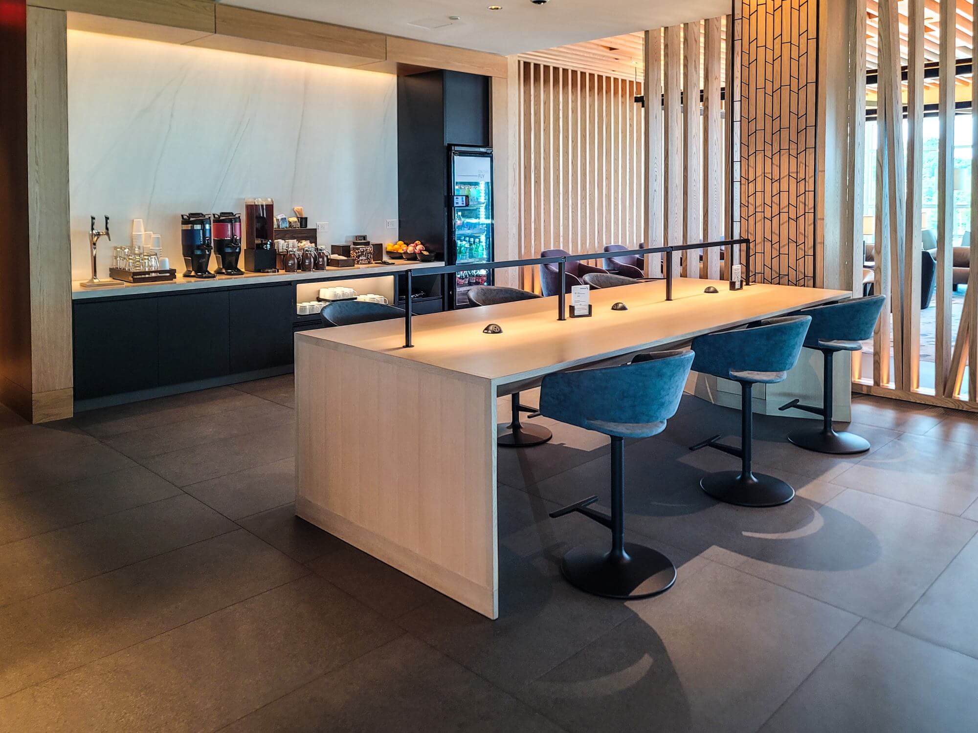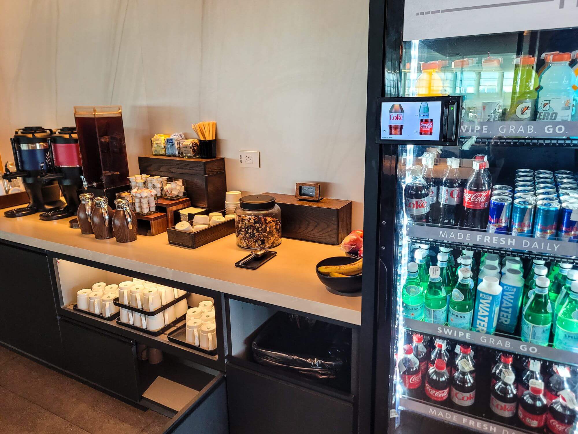 The relax area of the lounge has a counter with coffee and tea as well as a refrigerator which allows you to buy to-go drinks for your trip. You can use your credit card to pay for bottled sodas, water and energy drinks.