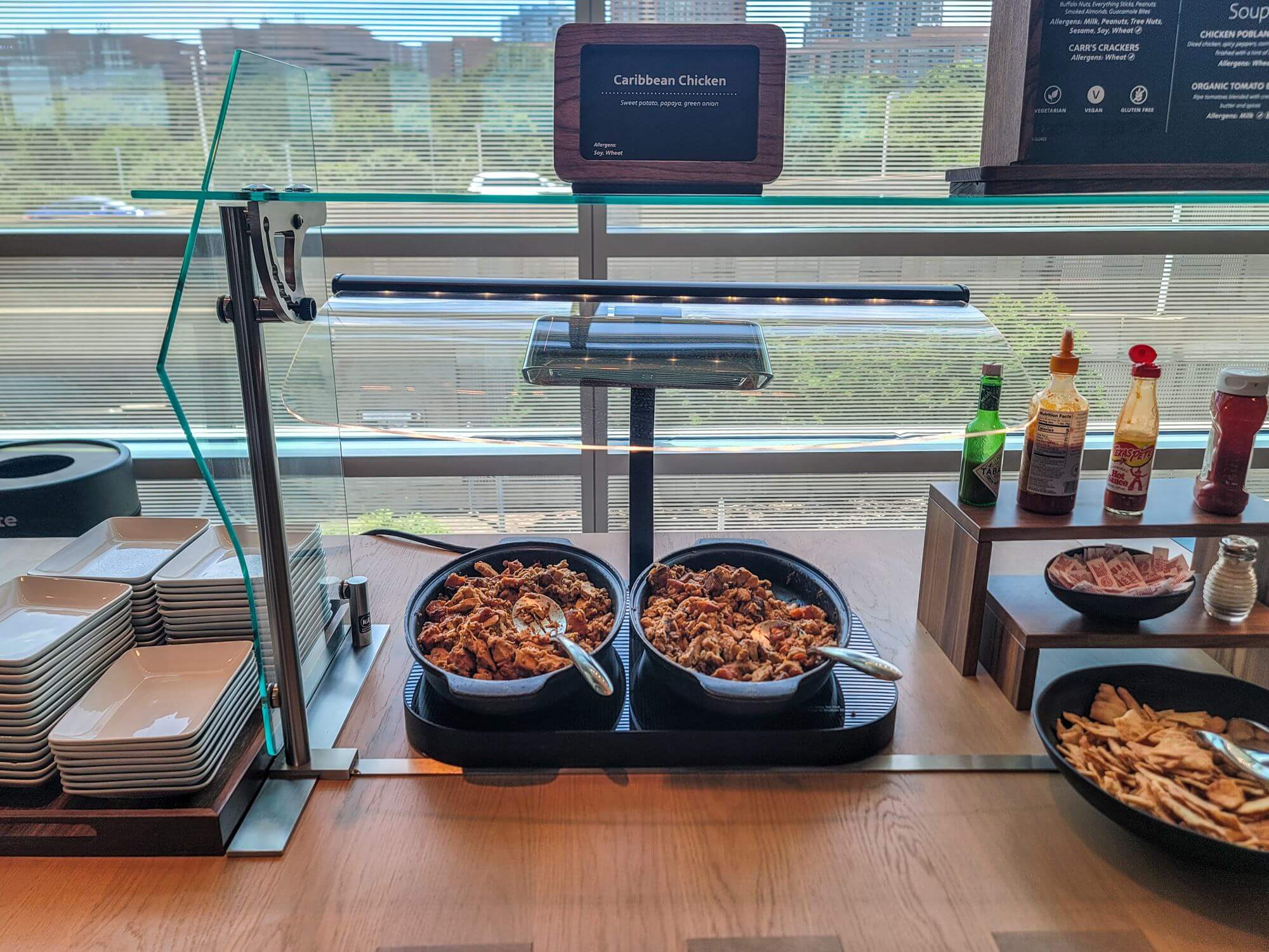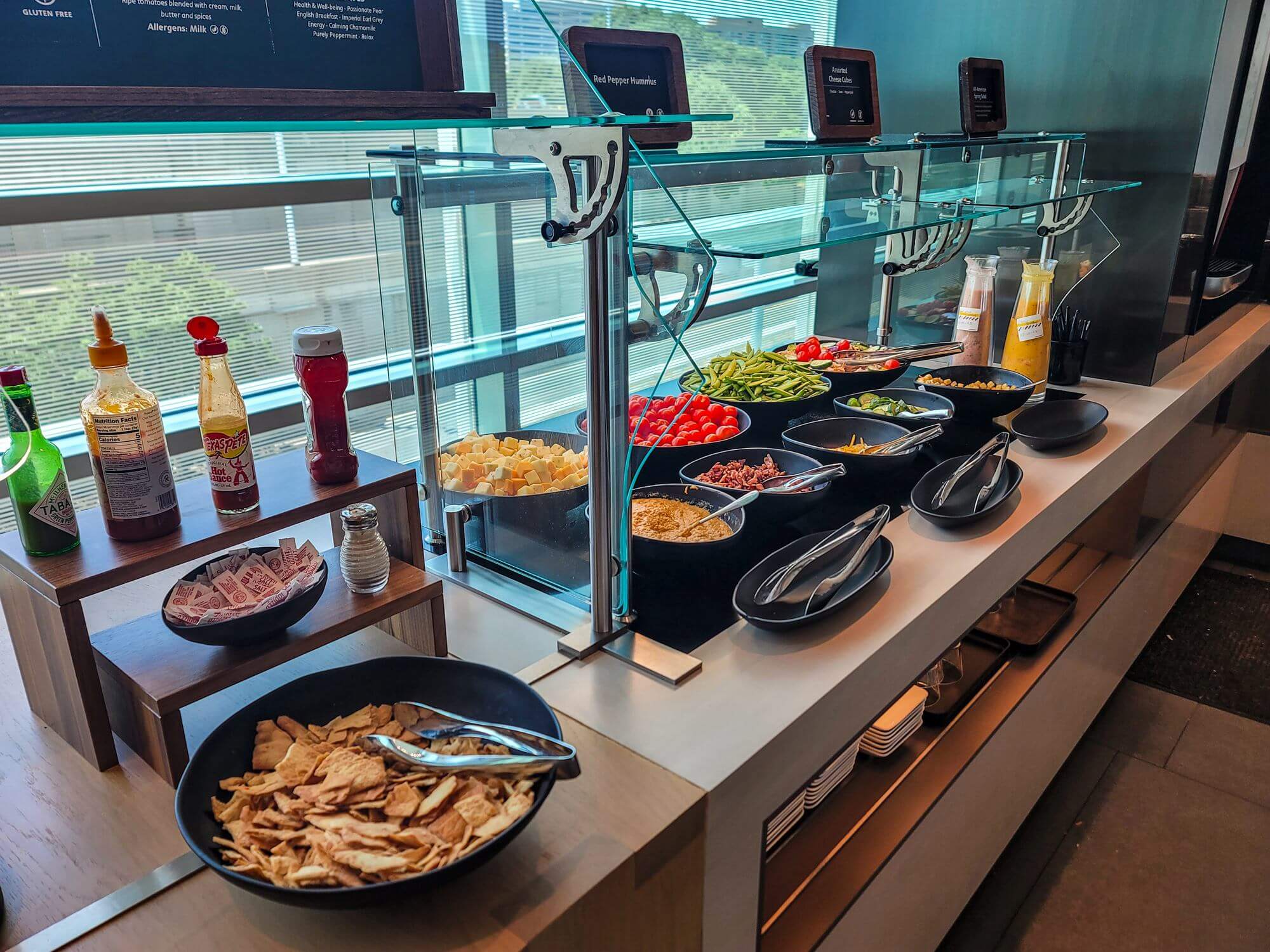 The area “behind” the check-in counter is the dining area. The buffet is set up here which offered hot food and other choices during my visit. The bar is right next to the buffet and offers a ton of complimentary drinks. It will get even better with the new enhancements AA announced a little while ago. The dining area has lots of dining tables available to sit down and enjoy your meal or just to set up your laptop and work.