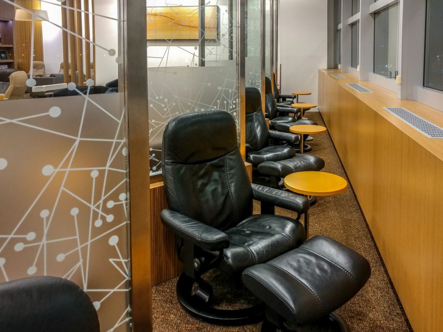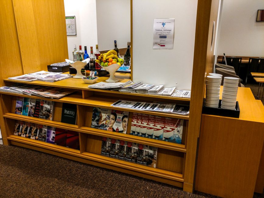 The lounge has only a view of the streets and no tarmac view. In front of the windows are chairs to lay down and relax. The main area has a variety of seating options with tables to enjoy your snacks or work with your PC. If you walk in, to the left you find the “business” area with a long desk along the wall with plenty of power outlets and seats. There are numerous placards throughout the lounge with instructions how to use the WiFi network.