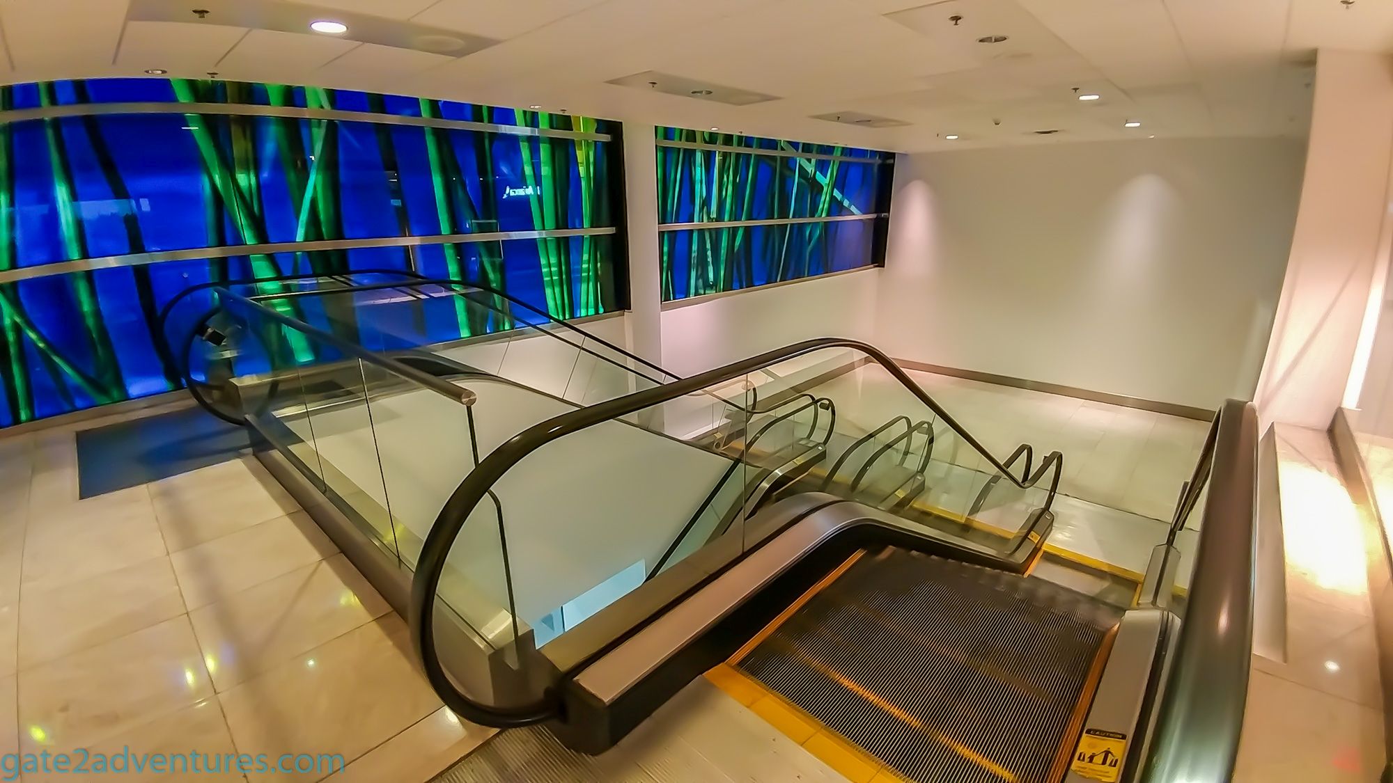 At the end, you make a right and walk down the terminal building. The lounge is next to gate J5, and the entrance is on your right-hand side. You can take the escalator or elevator up to the third floor. This entrance is for the LATAM VIP Lounge and the Avianca VIP Lounge. Once you are upstairs agents will ask you where you want to go and point you in the right direction to either of the lounges and their check-in counter.