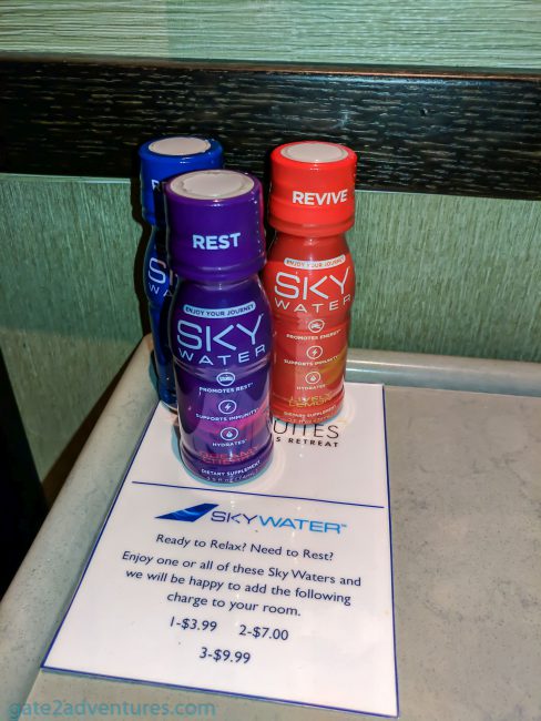 There are two water bottles next to the sofa which will be charged separately to your card on file, as well as the bottles of Skywater on the desk.