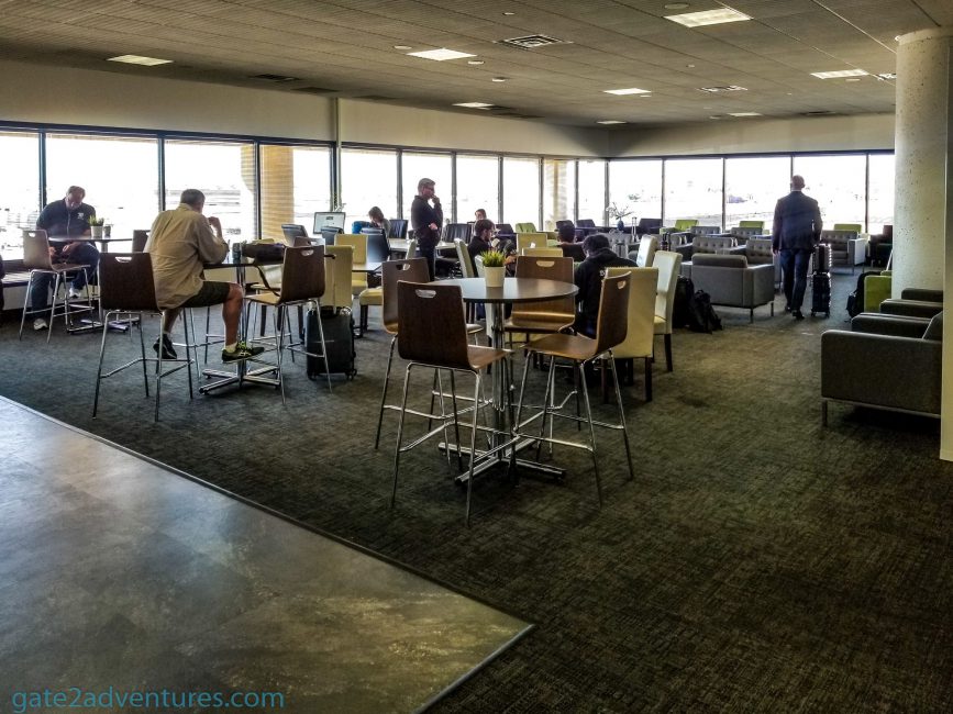 Well, it is just a big room with plenty of chairs and tables. A window wall wraps around the room along 2 sides of it and provides a view of the terminal and tarmac. Next to the entrance is a small snack bar as well as a small bar counter.