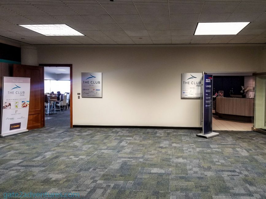 On my latest flight, I had a three-hour layover in Phoenix and decided to go back to the lounge to relax and get some work done. The location is still the same, but access has changed a bit. The Club added an additional room to the existing lounge you find in the review below. The reason is, that the lounge was closed for everyone except British Airways passenger from 2:30 p.m. until after the flight (BA288) departs.