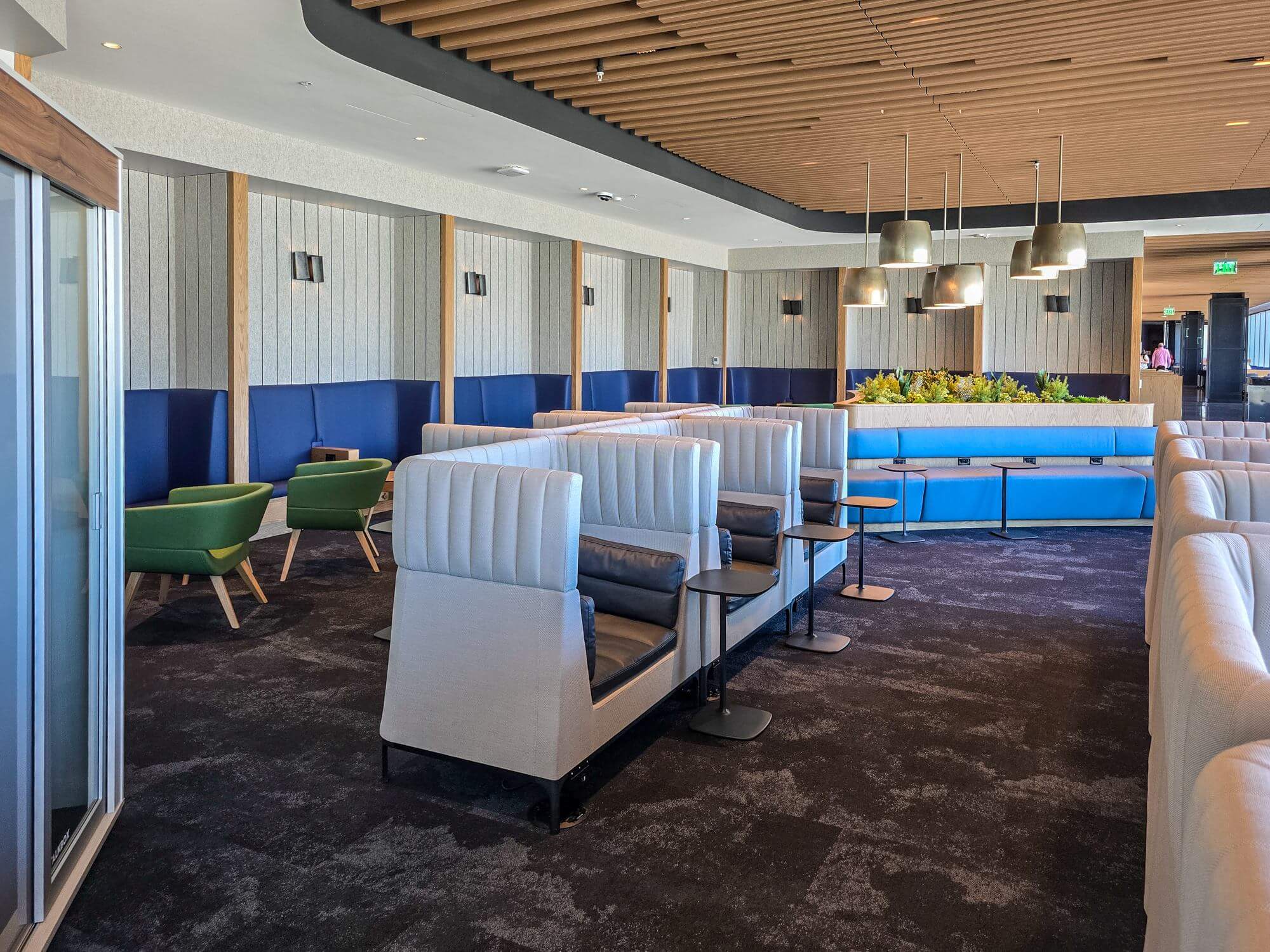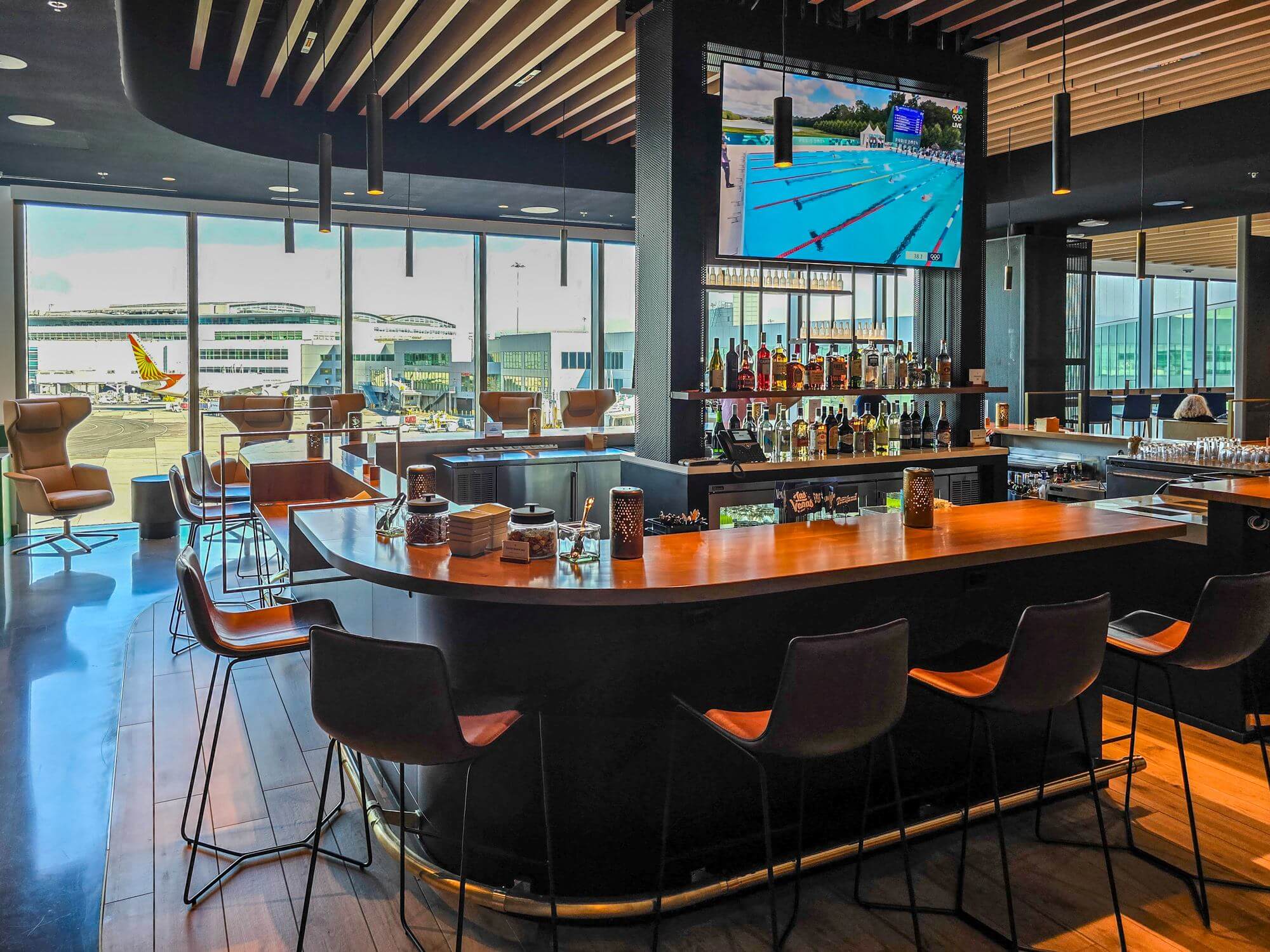 The floor-to-ceiling windows are stretching along the whole lounge space and give a great view of the tarmac. There is plenty of seating throughout the lounge. You can find everything from cozy loungers to dining tables next to the dining area.