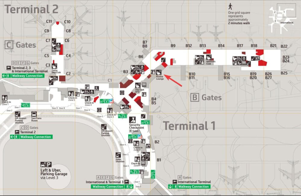 The Alaska Lounge at SFO is located across gate B6 in Terminal 1. You can’t miss it when you are walking towards the B-Gates. It will be on your right hand side.