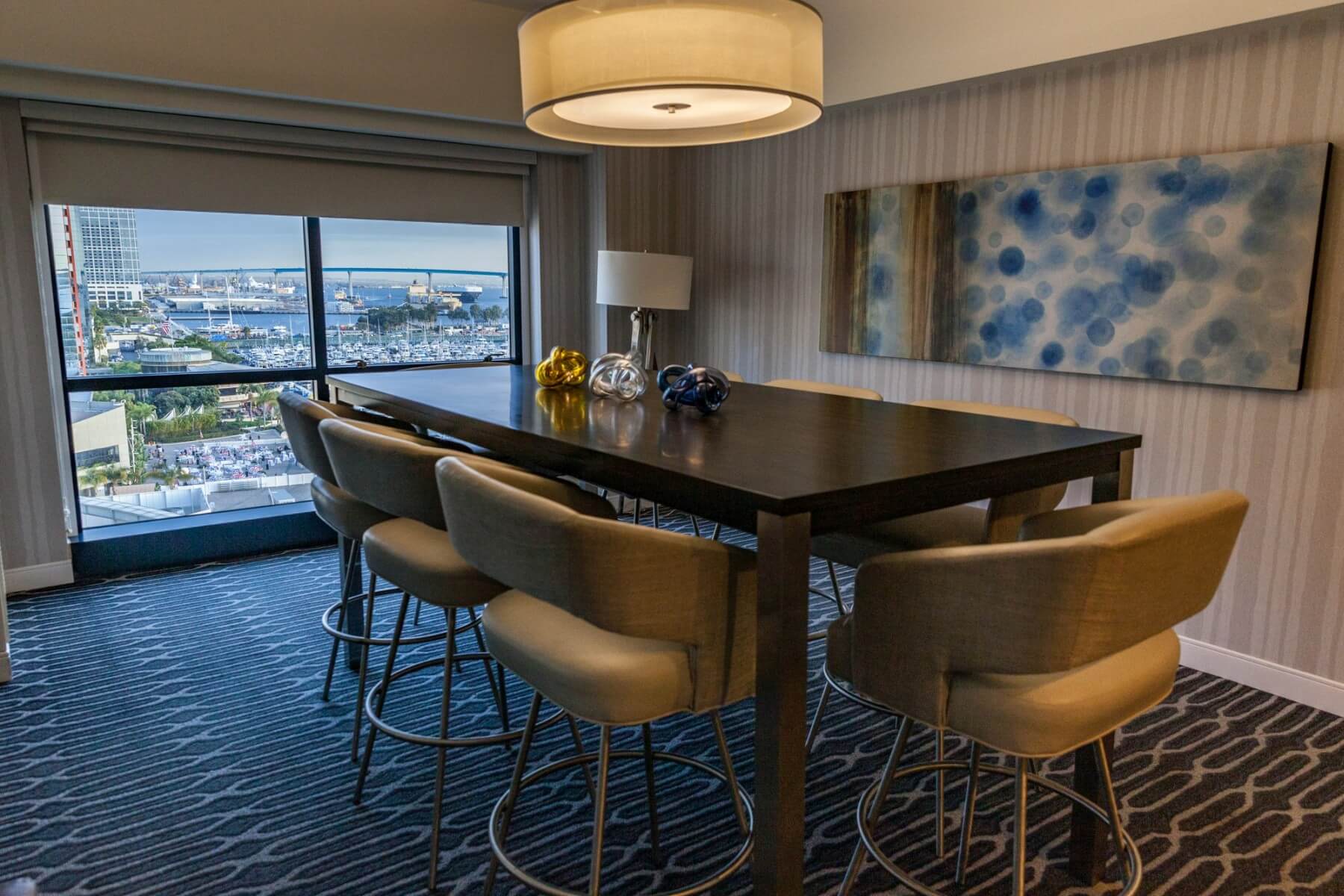 Inside you find plenty of seating, two workstations with a printer, a digital fireplace at the very end of the club space, next to the unisex restroom. It’s great to have a restroom in the lounge. Throughout the Grand Club, you can find interesting books and even some table games like a chessboard. From the west side of the building, you have a nice view of the harbor, the other hotel tower, and part of downtown. However, from the east side, you don’t get as much of a good view as there is some kind of a terrace here but not accessible for guests.