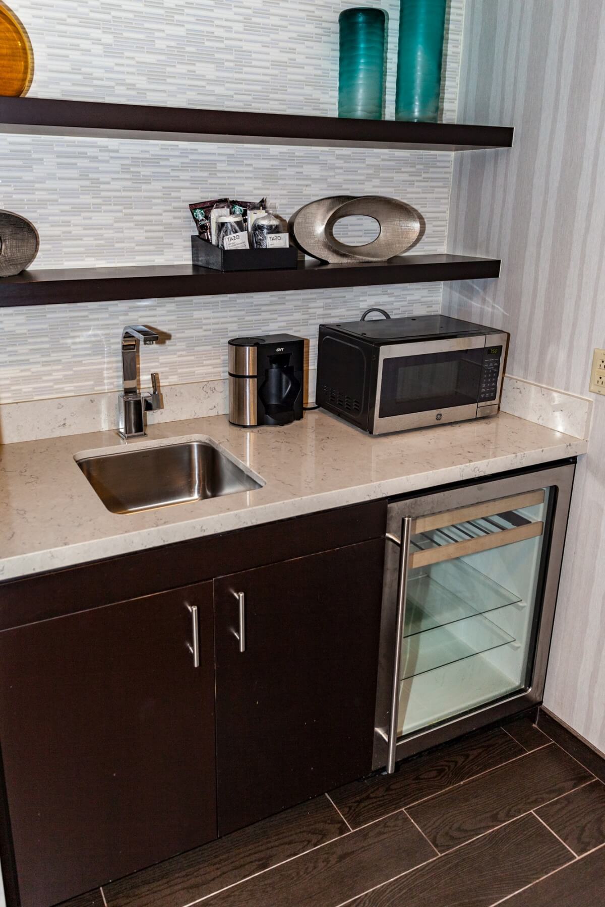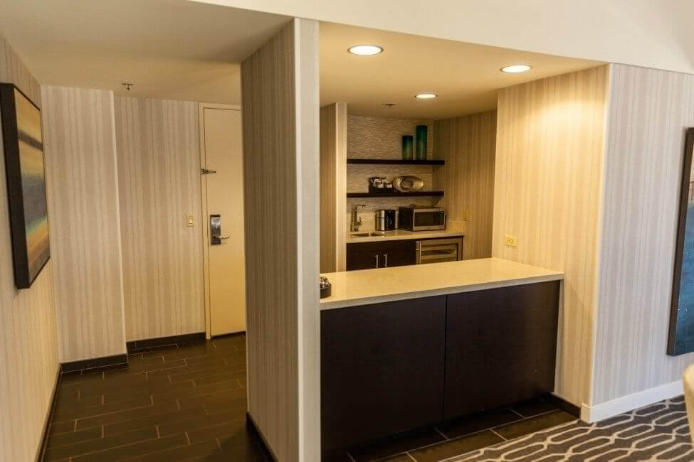 The second entrance is more of a “butler entrance” as it drops you straight out in the small kitchenette of the room. Inside the kitchenette are a wine cooler, small sink, microwave, and plenty of storage space.