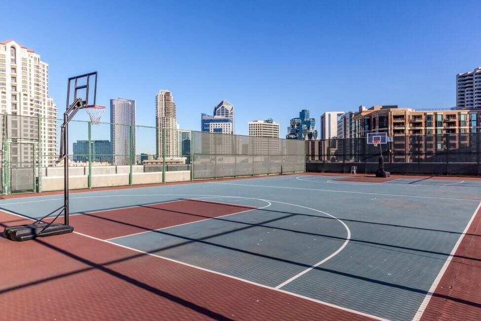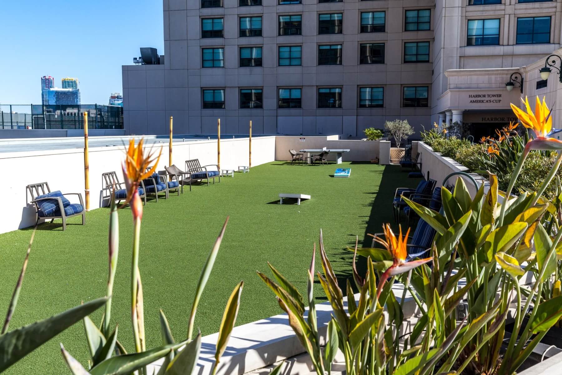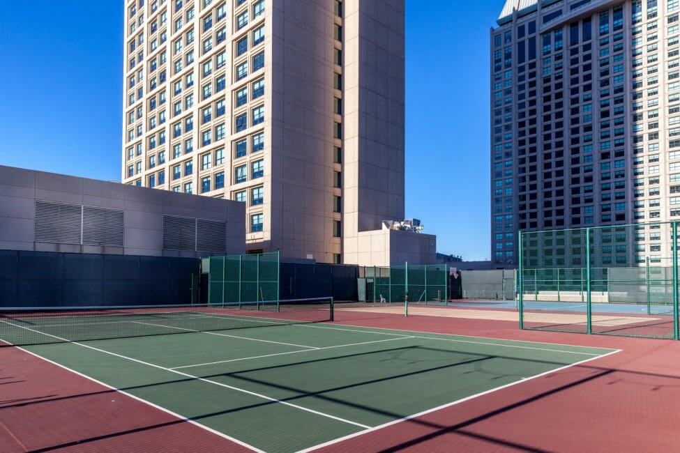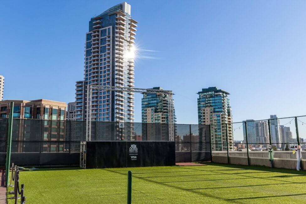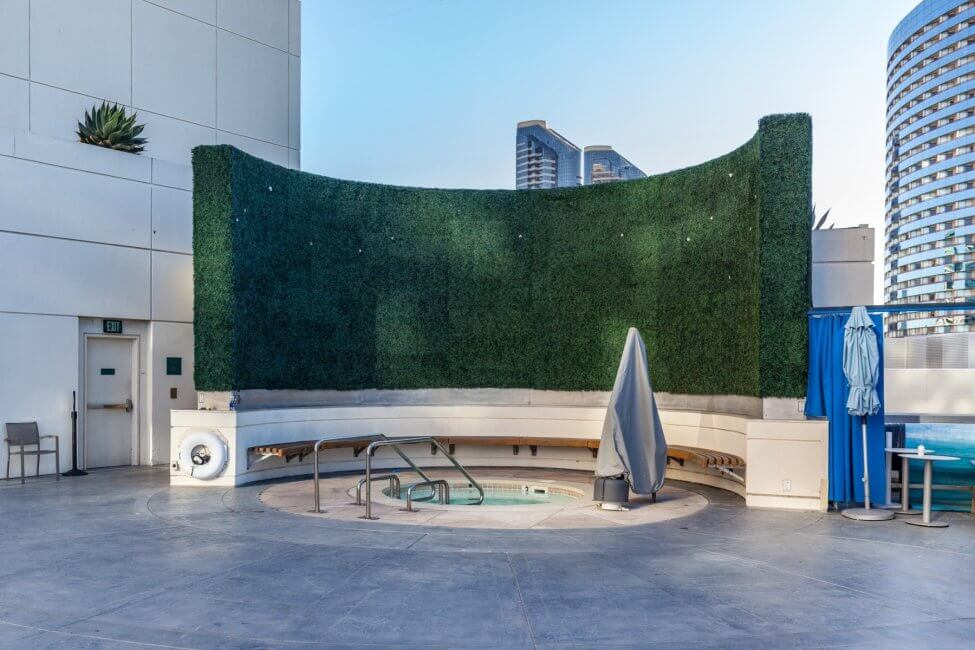 Walk back inside the harbor tower towards the escalator, bypassing the elevators. Follow the signs here to get to the sports court. Yeah, unbelievable but there is a rooftop sports court at the Manchester Grand Hyatt San Diego. Three fields are available for different games, which are basketball, volleyball (unfortunately no sand), and tennis. At the very end is the Rooftop Cinema Club. They weren’t showing anything during my stay. Check their website for showtimes and tickets. Usage of the sports court including the required equipment is complimentary and part of your destination fee. The sport courts remind me of the Grand Hyatt in Hong Kong which also had rooftop tennis courts and a driving range.