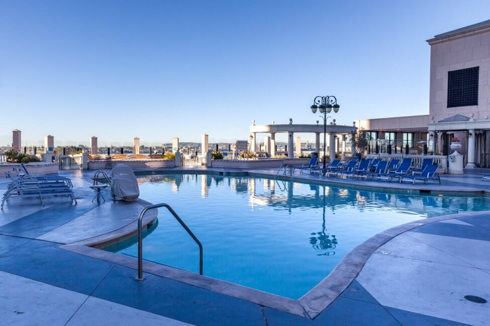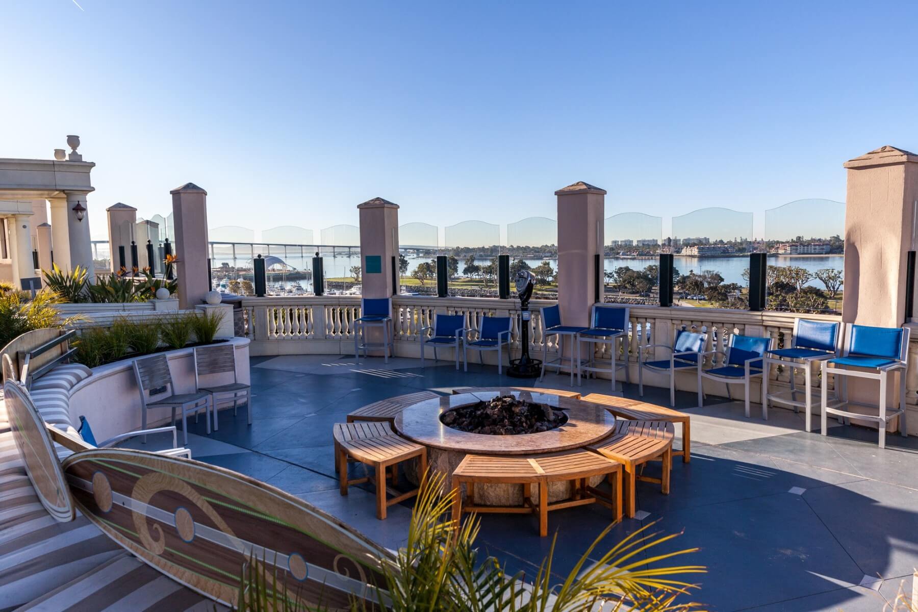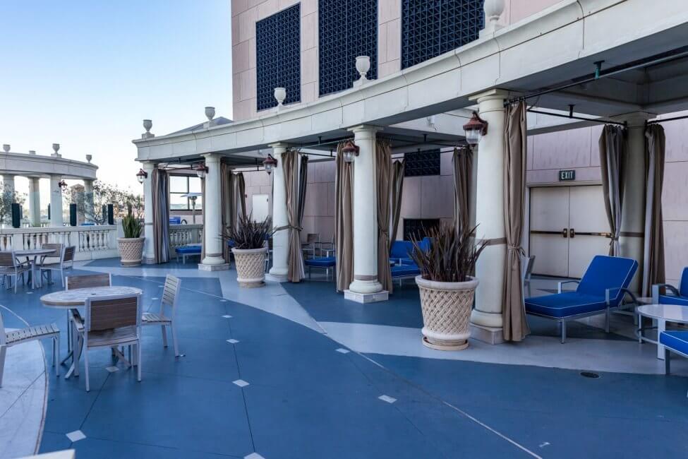 The fourth floor allows access to the rooftop of the building connecting both towers. This rooftop deck houses a pool with lots of pool loungers and cabanas all over the place. The pool actually feels a little bit small for the available area. This is a great place to hang out for the whole family. On either side of the deck, towards the waterfront are whirlpools. In between the two whirlpools is a firepit, perfect for roasting s’mores. There is plenty of seating around the firepit. This area offers a great view of the whole bay and the sunset.