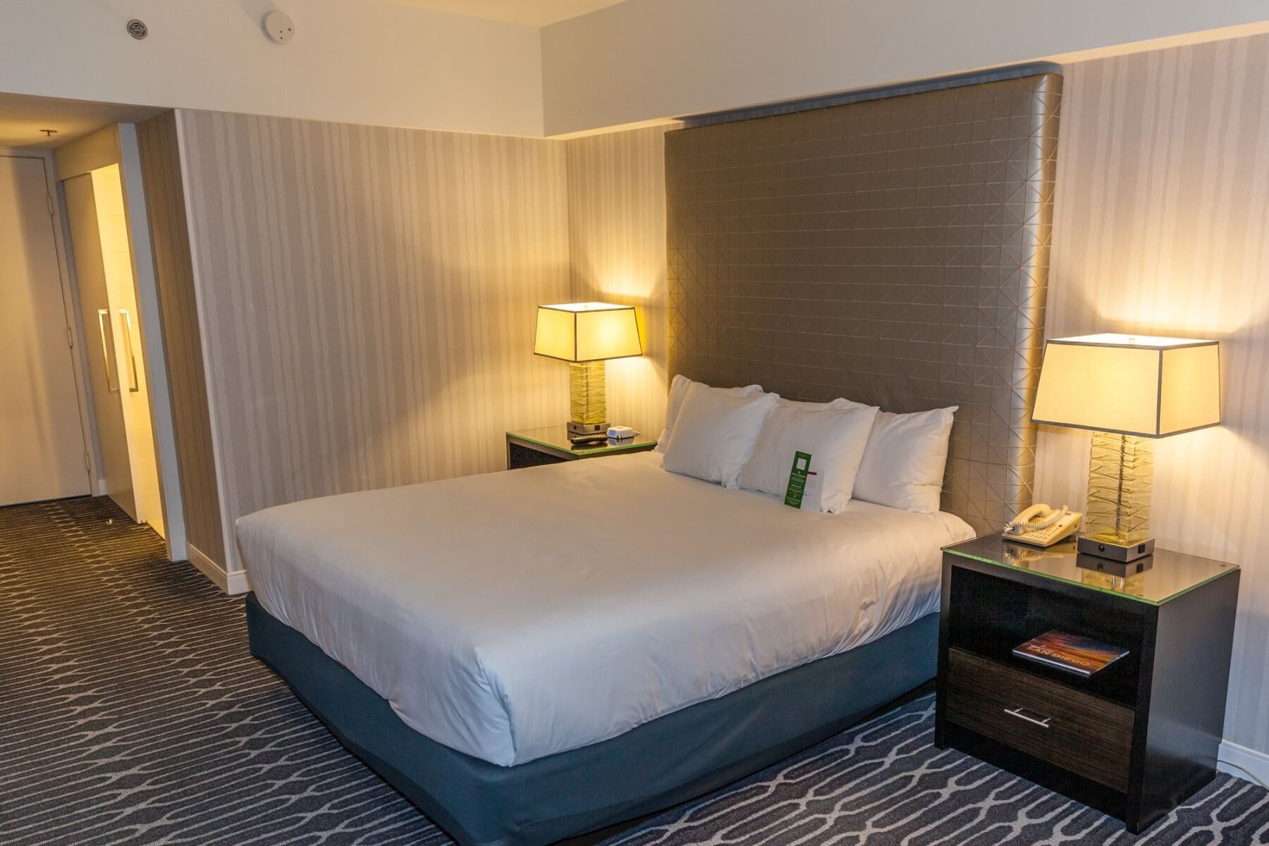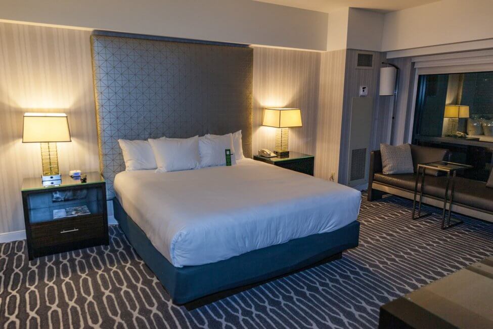The King bed is located off to left, against the wall. On either side of the bed are nightstands with light with an integrated power outlet. Each of the nightstands offers additional storage space.