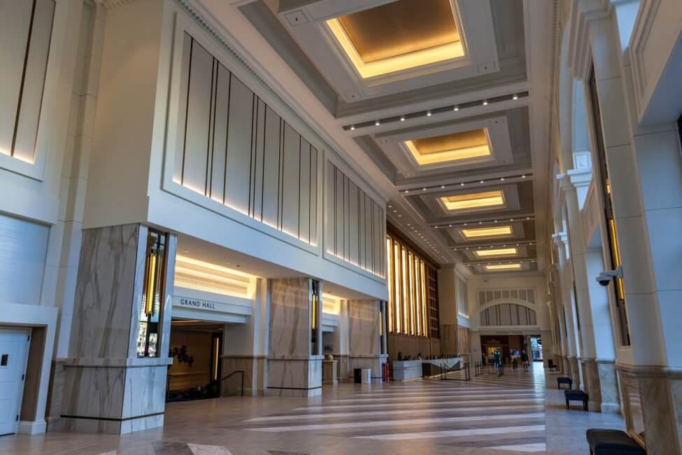 I had to park all the way at the top, as I wanted to get a spot close to the elevator to go back down to the lobby. From the elevator, it’s a short walk before you get into the grand lobby. I estimate it to be about three stories tall. The whole lobby just underwent renovation not too long ago. In the middle of the lobby is the front desk. I joined the line for elite guests and had only one person in front of me which was almost done by the time I arrived.