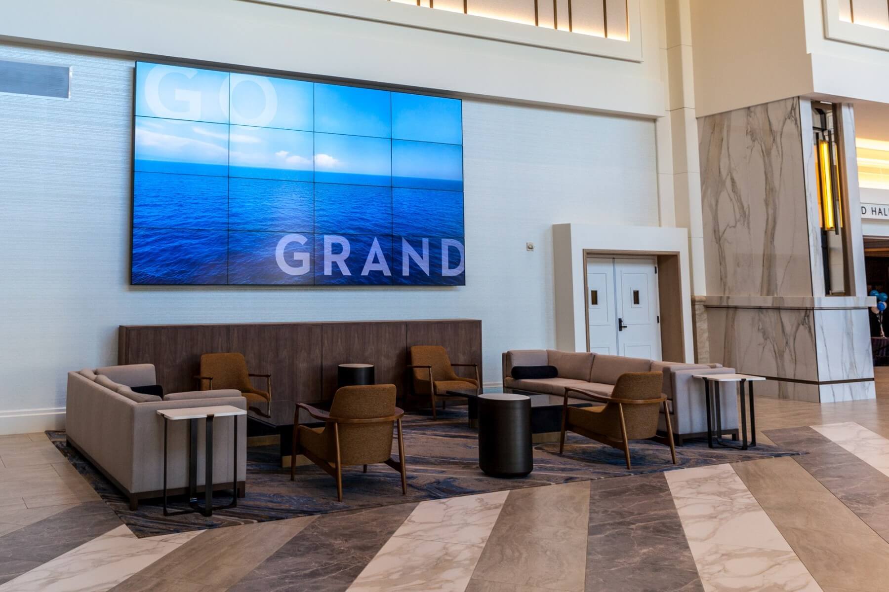The first thing everyone will notice is the huge lobby. It’s just gigantic and beautiful. There are is a seating area at the left end of the lobby right under a big TV screen. It’s worth watching the TV as they show cool and amazing places you should visit which are recommended by the hotel staff. Opposite the big TV screen is a Hertz rental car counter. The opening times seem to be rather limited, as I don’t always saw an agent there.