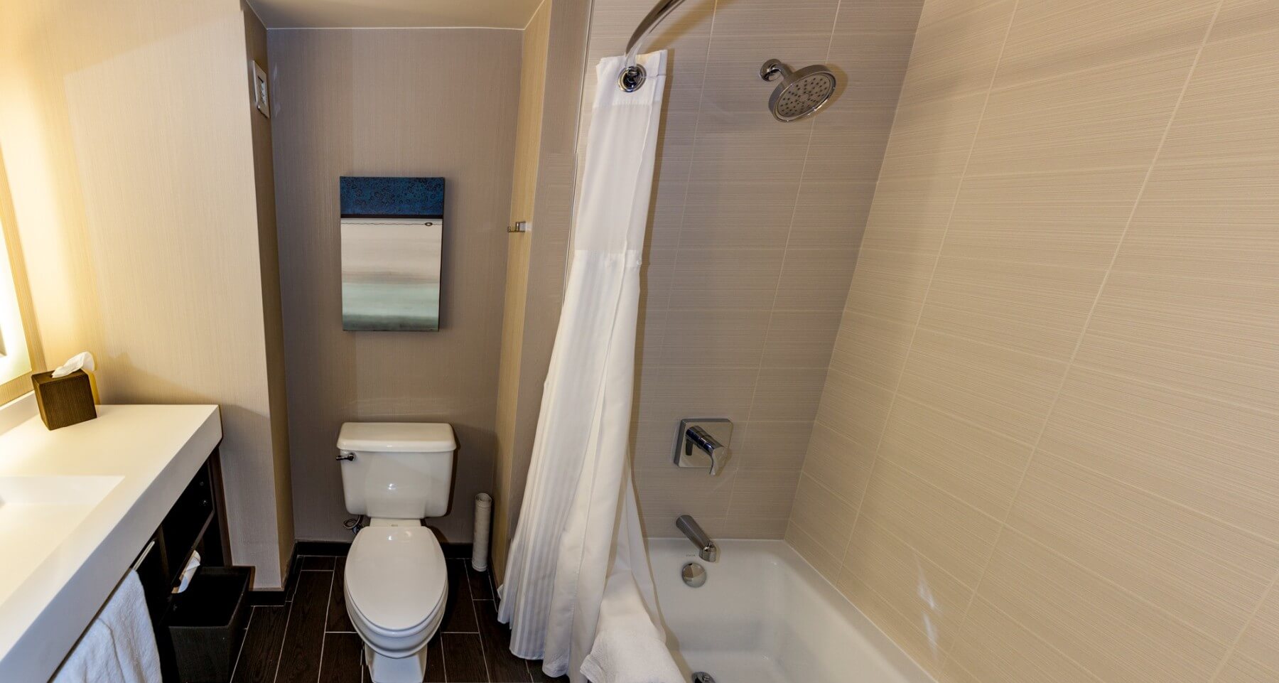 As mentioned, the living space has two entrances. One is the main entrance which has the guest bathroom right next to the entrance door before you enter the actual living space. The guest bathroom comes with a shower/tub combination and a nice and large vanity. Opposite of the bathroom is a wall closet.