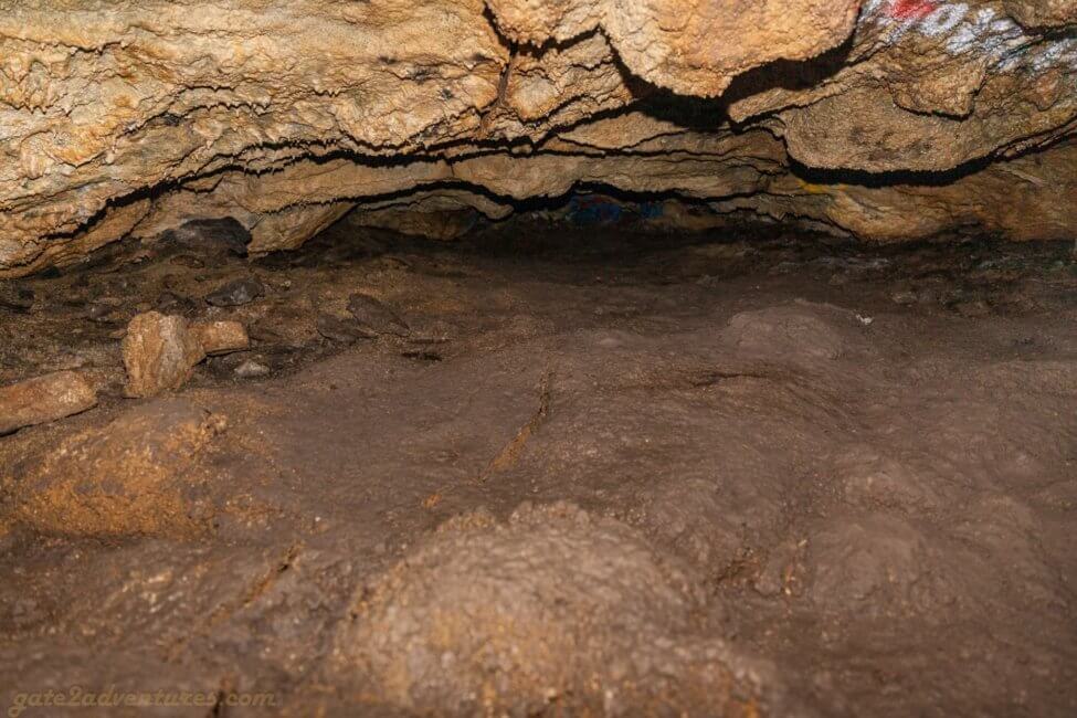 As you continue you will have to get over bigger piles of rock. These rocks fell from the ceiling and piled up in the cave. You can walk around some of them, but you also have to climb over a few of them to get to the end of the cave. Be careful as the rocks can be slippery, and we all want to avoid any injuries. The passageway through the cave gets pretty narrow and small at some points. Be careful not to hit your head either. For the most part of the cave, you can walk upright, I am pretty tall and had no issues walking comfortably upright. It’s hard to judge this based on the photos. Unfortunately, I was just by myself and couldn’t take a picture with someone else as a reference. By the way, you are exploring this cave at your own risk, I am not liable if anything happens.