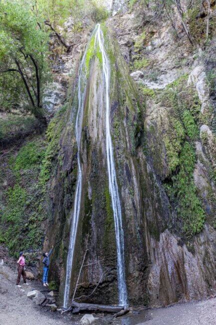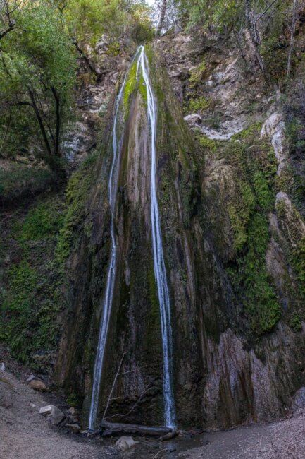 Once passed the barricades, you walk around the bend and the majestic waterfall is right in front of you. Well, majestic might be an overstatement, but the waterfall is still pretty to look at. Water drops about 80 ft down and then follows the creek. Most of the year, just a small stream will run down the face of the waterfall which splits into two parts at the top. I love how the ferns paint the front of the cliff green. During the rainy season and after heavy rainfalls the water flow increased drastically and you can hear the water roar over the cliff’s edge tumbling down into the creek from even further away.