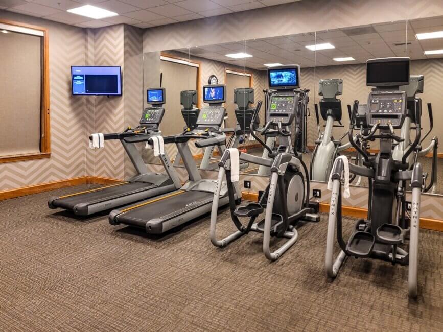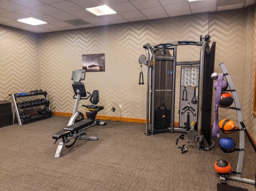 The fitness center is located on the ground floor along the long hallway from the front desk to the elevators. You need your room key to enter and it has a good selection of workout equipment.