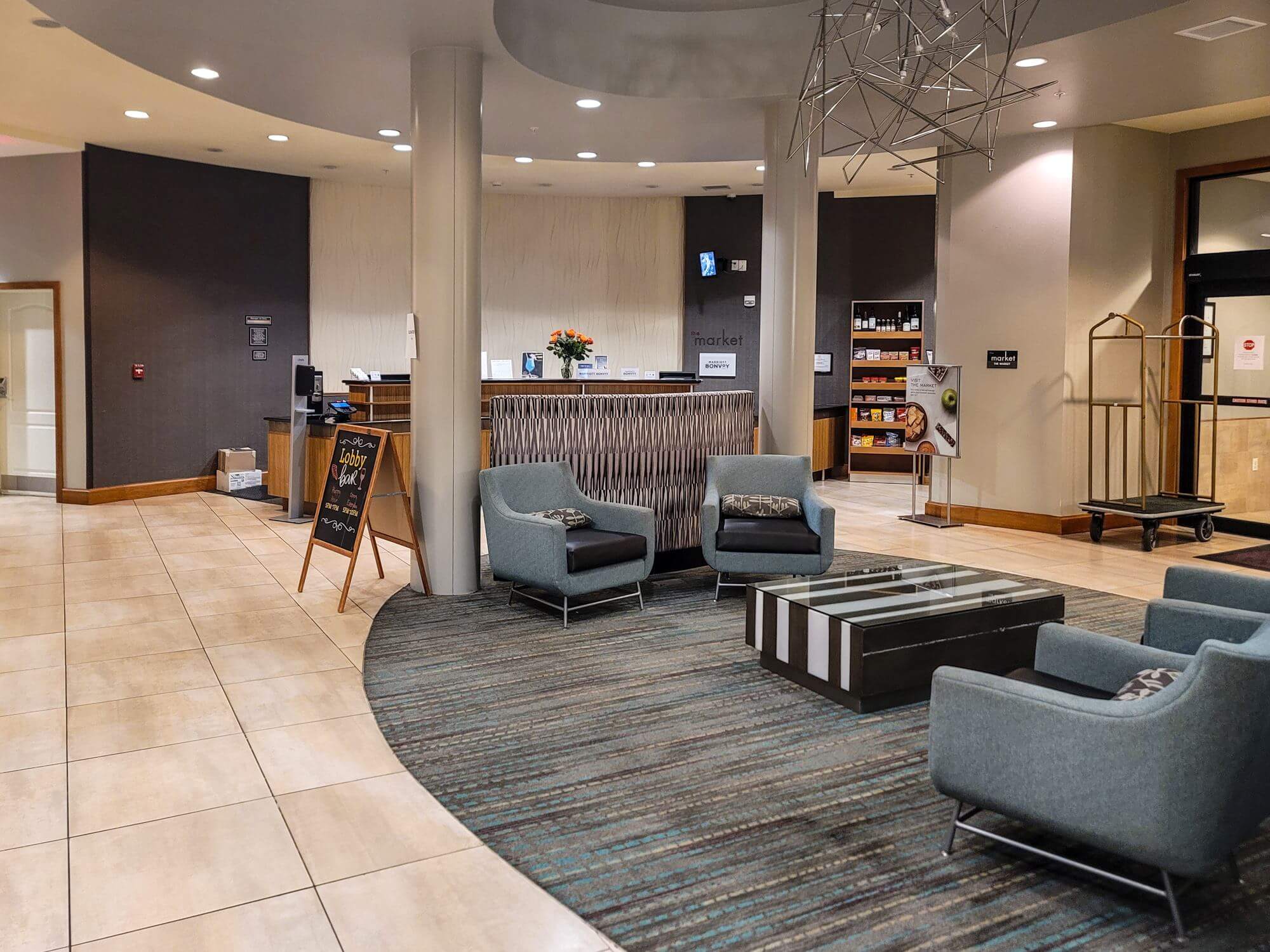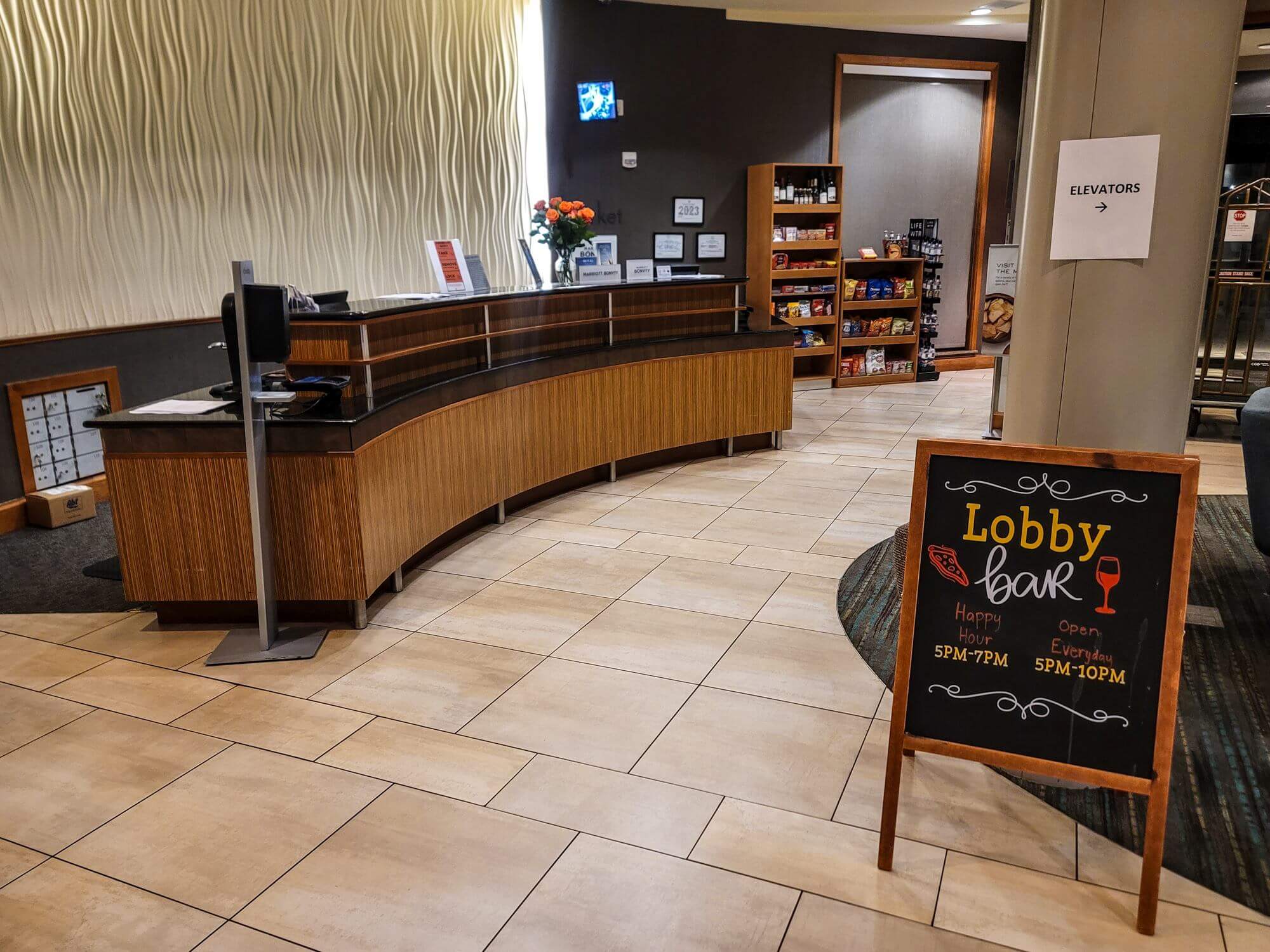The lobby also has doors leading out to the intersection on which the hotel sits, but these automatic doors are turned off and you have to use the door in the back leading to the courtyard and the hotel’s driveway.