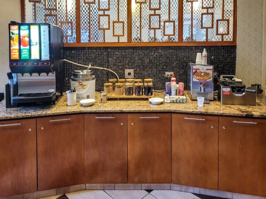 The lobby area has a few seating options to hang out which are not really part of the bar or the breakfast dining area. Besides that, it also holds two workstations, which make up the business center of the hotel. Kind of in the middle of the lobby is a fire place, but I never saw it lit.