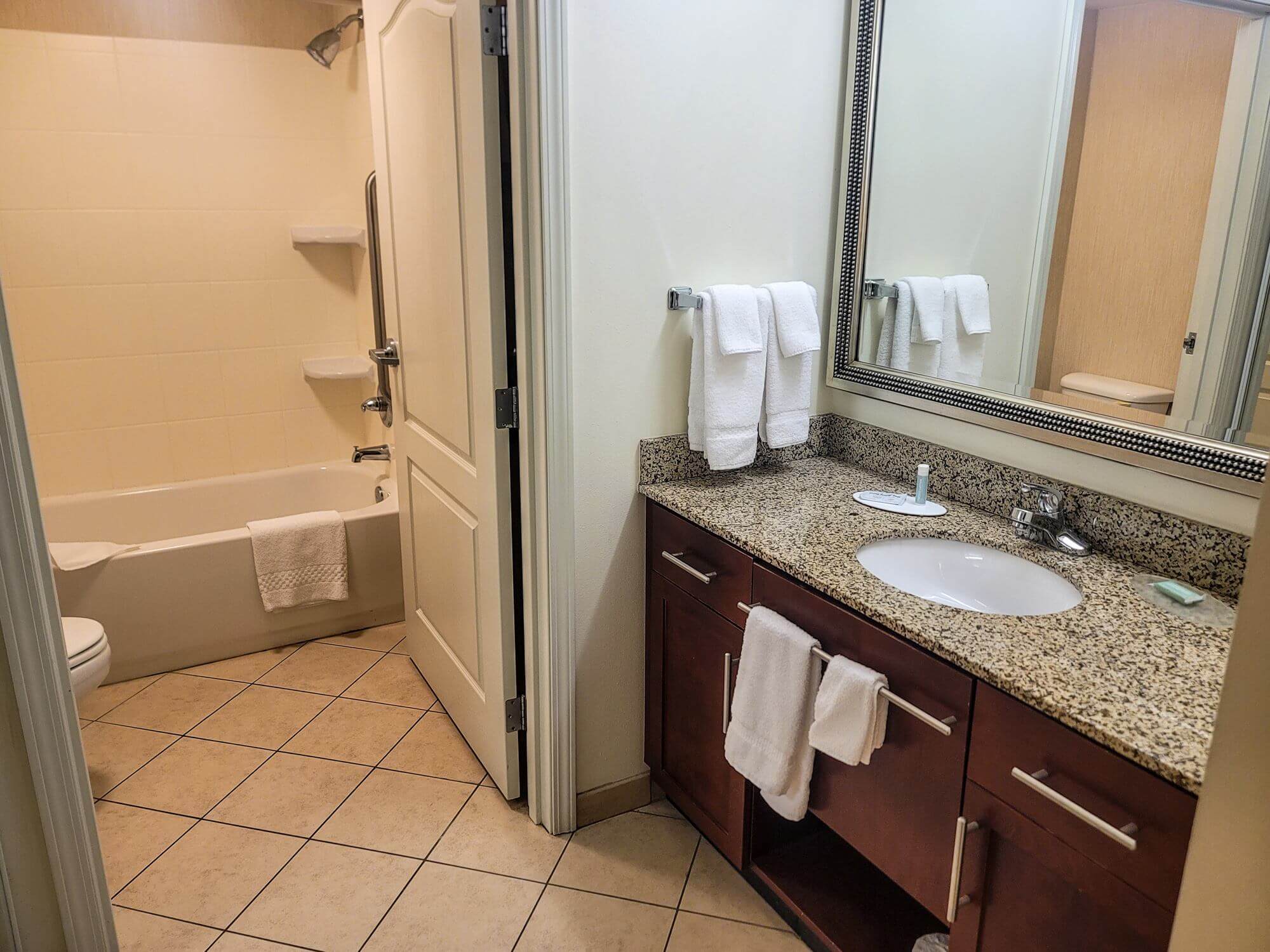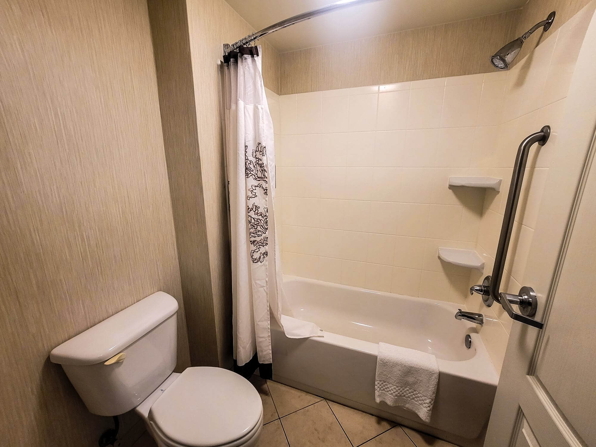 Next to the bed is the entryway to the bathroom. The entryway houses the vanity with a single sink, wall mounted mirror and a large closet. A door separates the bathroom from the rest of the suite. Inside is a shower/bathtub combo unit with wall-mounted soap dispensers as well as the toilet and a rack for the towels.