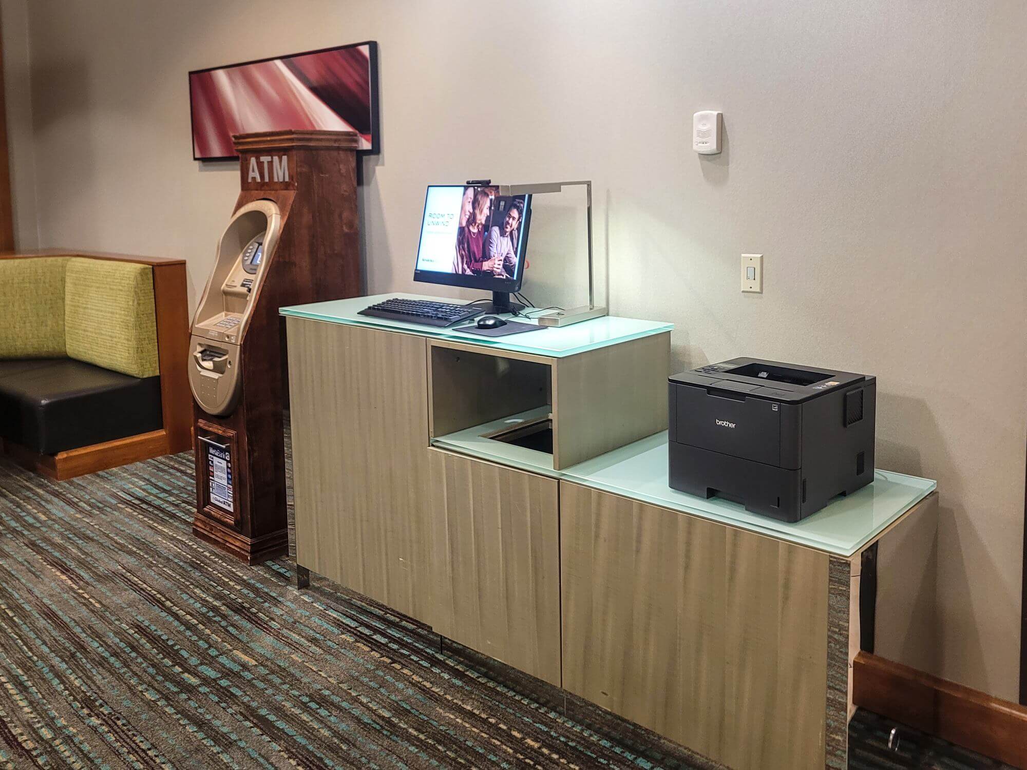 There are two workstations with a printer each in the lobby. One comes with an office chair, the other one is a standing counter. They are both located in the main lobby area.