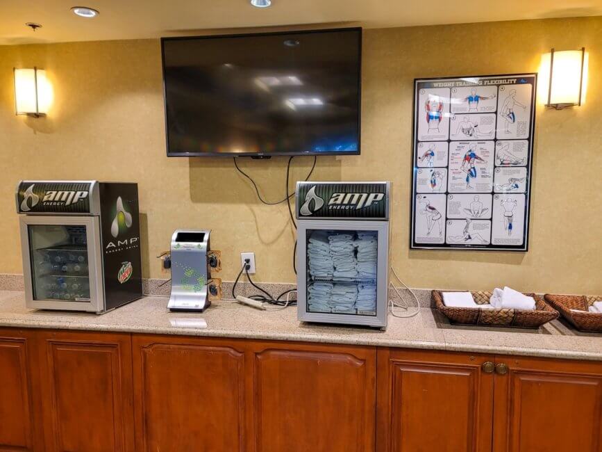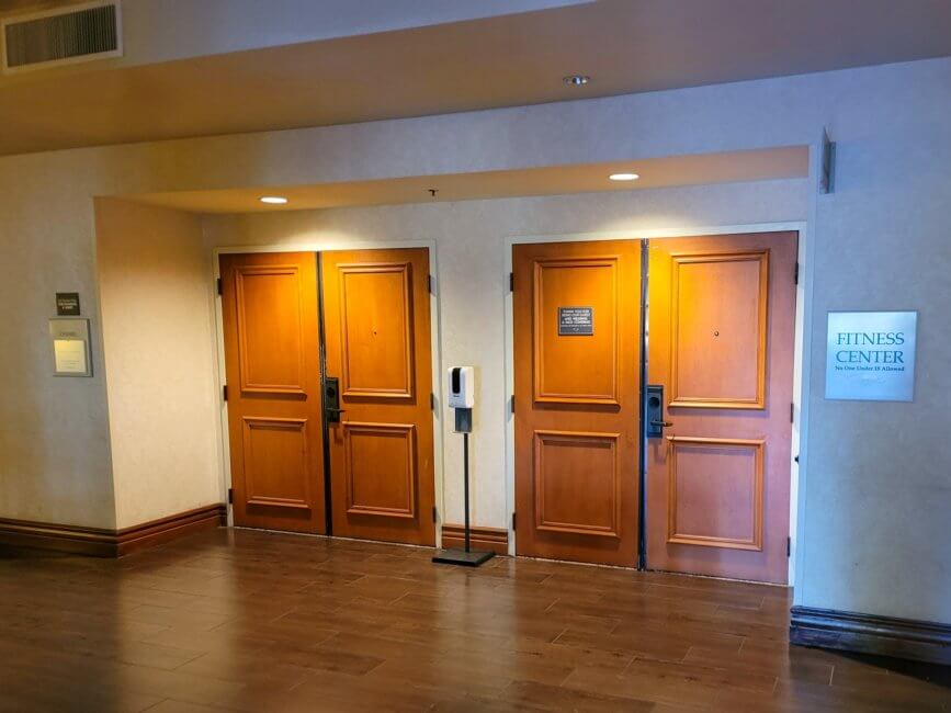 It took me a bit to find the fitness center. Even with all the posted signs, I walked by the entrance door to the actual fitness center. The door is the first double door next to the Starbucks in the lobby. A place where I didn’t expect a fitness center. You need your room key to enter, and you will find a well-sized fitness center inside with all the typical workout gear. It also has a view of the pool area.