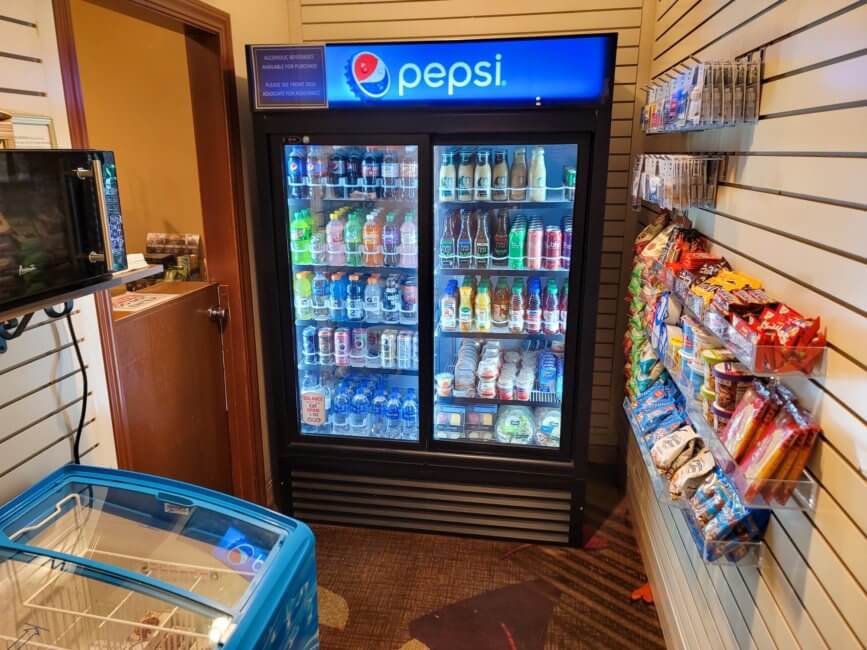 There is a small market next to the front desk. Inside is a limited selection on snacks and drinks as well as other things you might need during your stay here.