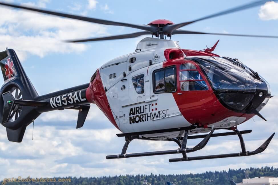 While waiting for the big bird to arrive, there were plenty of other plane spotting opportunities. Lots of planes were flying overhead towards Seattle-Tacoma International Airport. While also plans departed and landed at Boeing Field. Mostly smaller aircraft but two highlighted were a Gulfstream G650ER and a Eurocopter EC635 of Airlift Northwest. The helicopter was landing just about 150 ft away from my spotting location. I have never been that close to a flying helicopter. Don’t worry, I was safe and parked outside the fence in the parking lot.